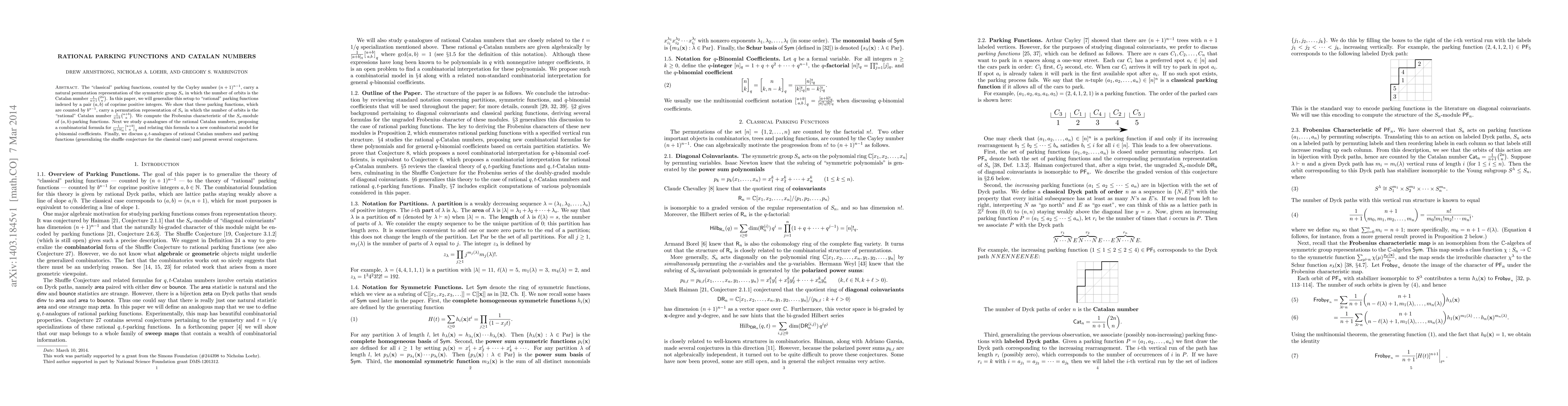 This paper generalizes classical parking functions to rational parking functions indexed by coprime integers (a,b), showing they count by b^(a-1) and relate to a permutation representation of S_a, with orbits given by rational Catalan numbers. It proposes a combinatorial formula for q-analogues of these numbers and discusses q,t-analogues, along with several conjectures.