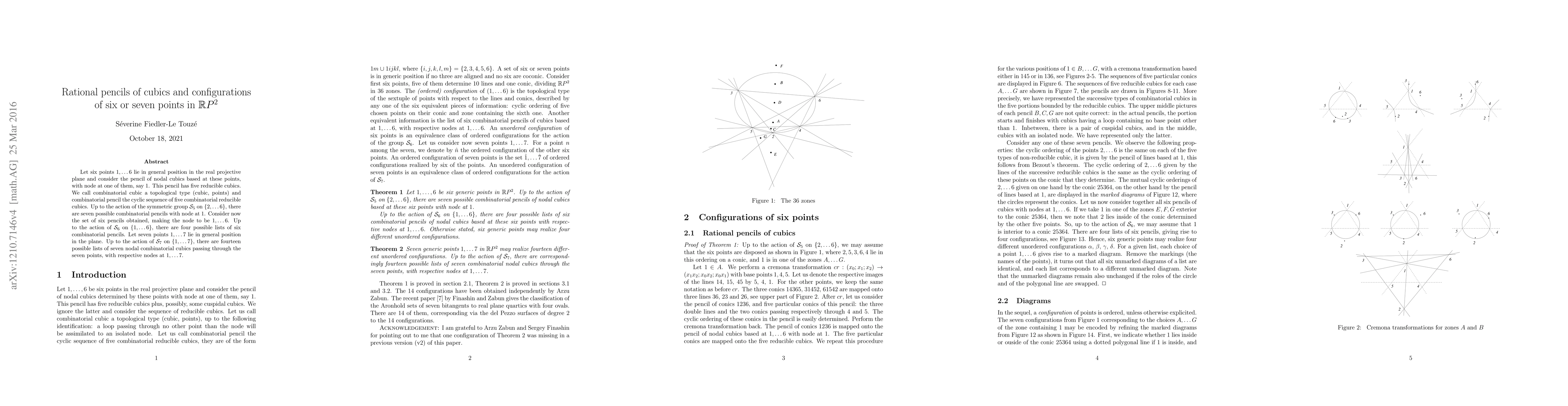 Let six points $1, ...6$ lie in general position in the real projective plane and consider the pencil of nodal cubics based at these points, with node at one of them, say 1. This pencil has five reducible cubics. We call combinatorial cubic a topological type (cubic, points), and combinatorial pencil the cyclic sequence of five combinatorial reducible cubics. Up to the action of the symmetric group $S_5$ on $\{2, ...6\}$, there are seven possible combinatorial pencils with node at 1. Consider now the set of six pencils obtained, making the node to be $1, ...6$. Up to the action of S_6 on ${1, ...6}$, there are four possible lists of six combinatorial pencils. Let seven points $1, ...7$ lie in general position in the plane. Up to the action of $S_7$ on $\{1, ...7\}$, there are fourteen possible lists of seven nodal combinatorial cubics passing through the seven points, with respective nodes at $1, ...7$.