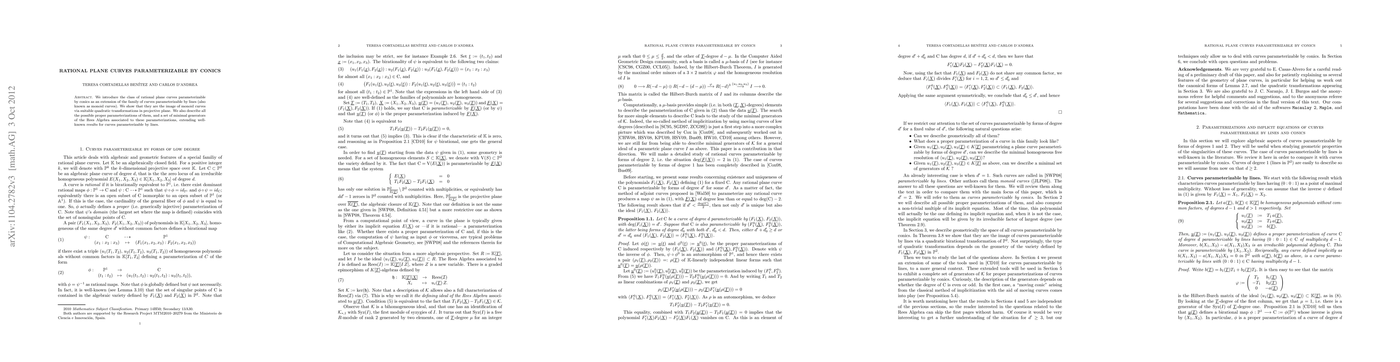 The paper presents a detailed classification and characterization of rational plane curves parameterizable by conics, along with the associated Rees Algebra generators.