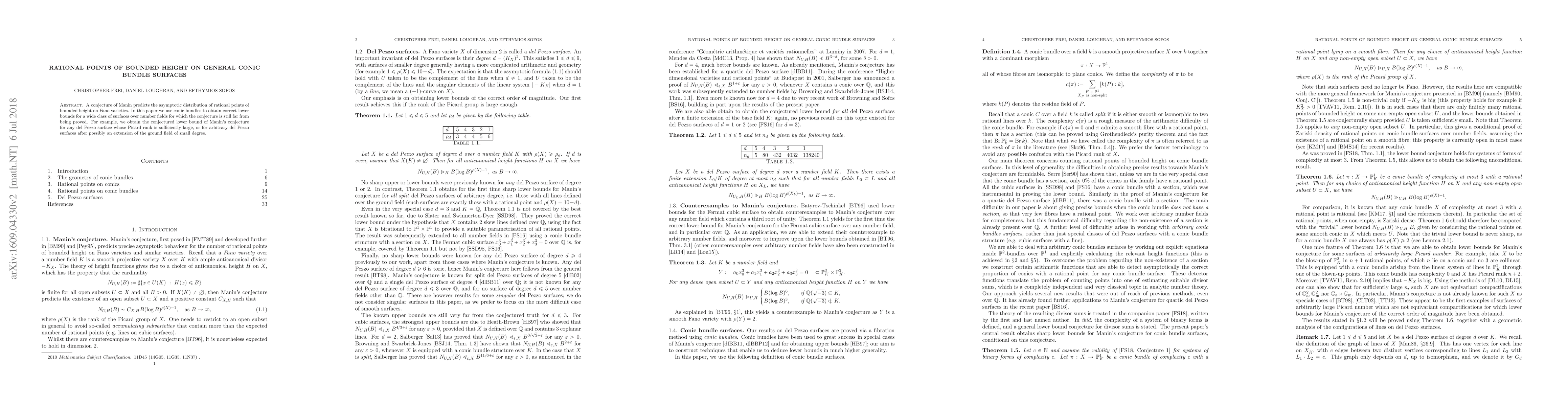 The paper employs techniques from arithmetic geometry, specifically utilizing conic bundles and the Manin conjecture to analyze rational points of bounded height on Fano varieties.
