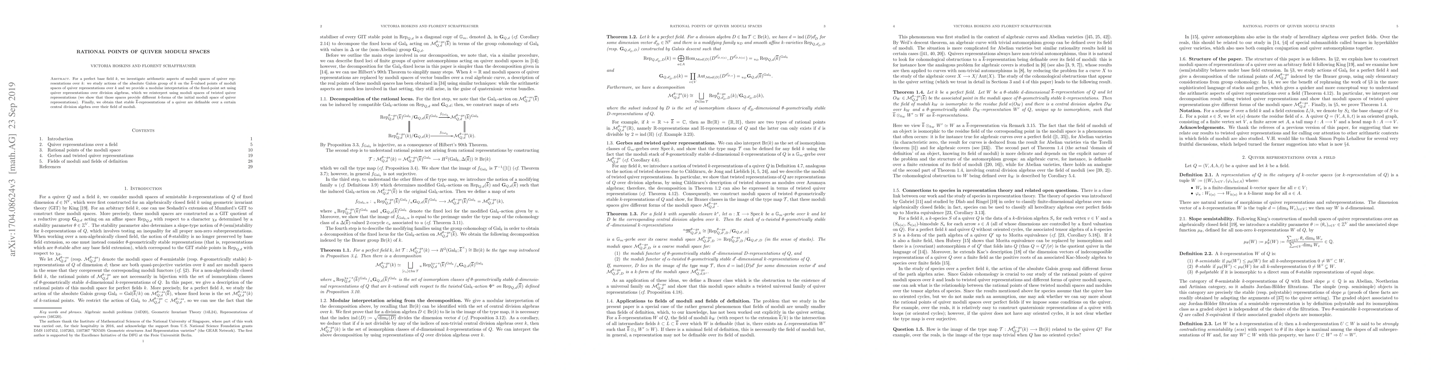 This paper examines the Galois group's action on $\bar{k}$-valued points of quiver moduli spaces over a perfect field $k$, revealing a decomposition of $k$-rational points indexed by elements in $k$'s Brauer group, interpreted through quiver representations over division algebras and twisted quiver representations.
