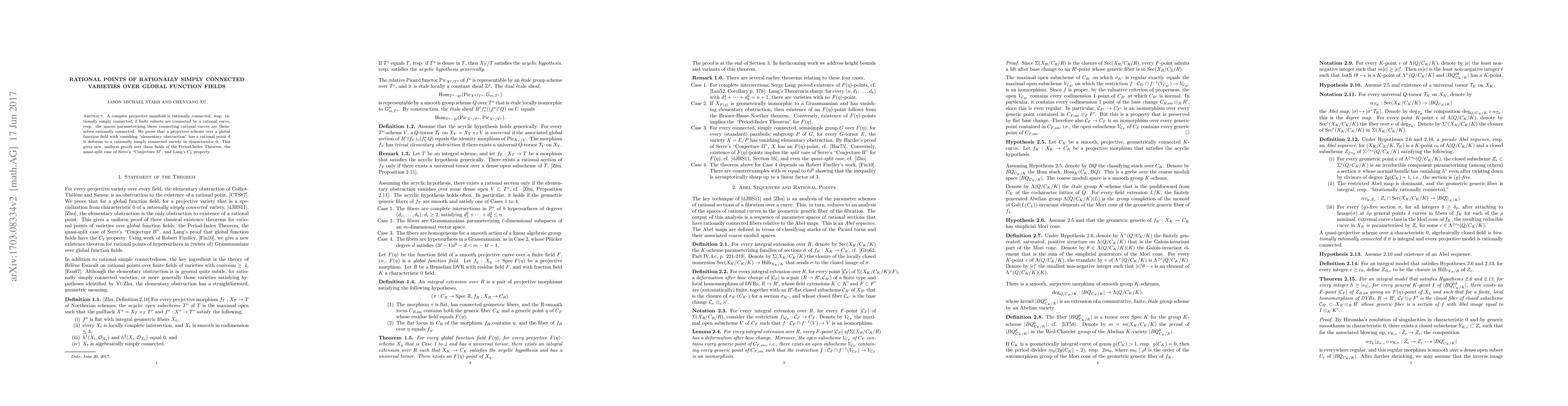 A complex projective manifold is rationally connected, resp. rationally simply connected, if finite subsets are connected by a rational curve, resp. the spaces parameterizing these connecting rational curves are themselves rationally connected. We prove that a projective scheme over a global function field with vanishing "elementary obstruction" has a rational point if it deforms to a rationally simply connected variety in characteristic 0. This gives new, uniform proofs over these fields of the Period-Index Theorem, the quasi-split case of Serre's "Conjecture II", and Lang's $C_2$ property.