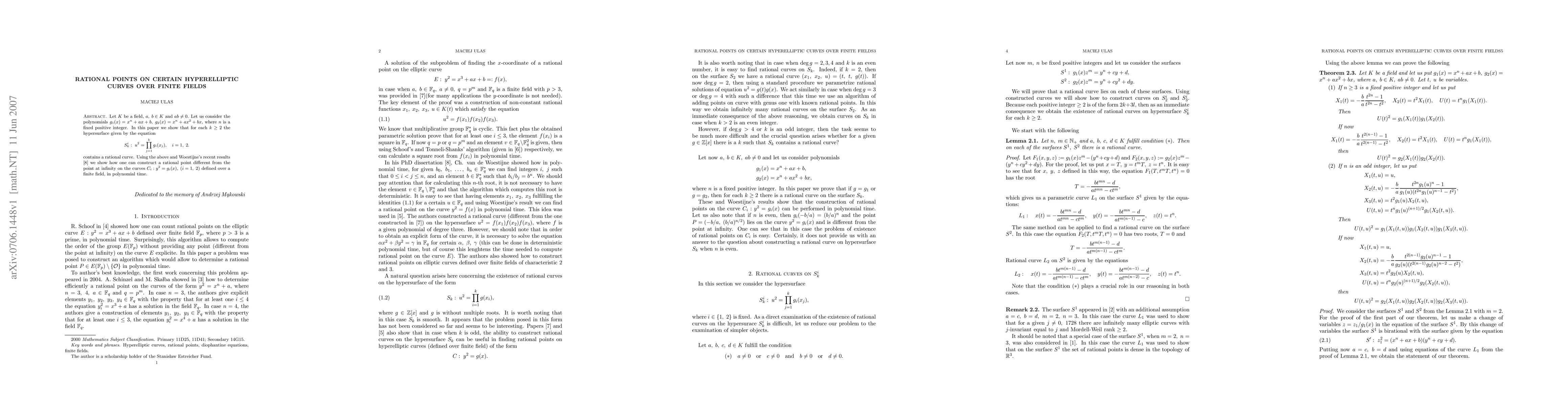 Let $K$ be a field, $a, b\in K$ and $ab\neq 0$. Let us consider the polynomials $g_{1}(x)=x^n+ax+b, g_{2}(x)=x^n+ax^2+bx$, where $n$ is a fixed positive integer. In this paper we show that for each $k\geq 2$ the hypersurface given by the equation \begin{equation*} S_{k}^{i}: u^2=\prod_{j=1}^{k}g_{i}(x_{j}),\quad i=1, 2. \end{equation*} contains a rational curve. Using the above and Woestijne's recent results \cite{Woe} we show how one can construct a rational point different from the point at infinity on the curves $C_{i}:y^2=g_{i}(x), (i=1, 2)$ defined over a finite field, in polynomial time.