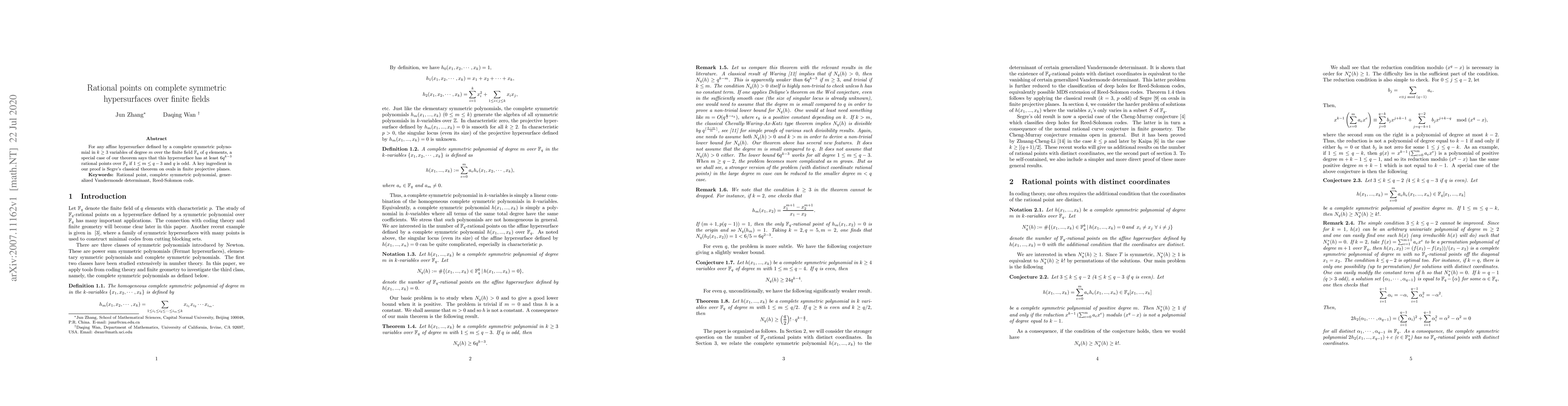 For any affine hypersurface defined by a complete symmetric polynomial in $k\geq 3$ variables of degree $m$ over the finite field $\mathbb{F}_{q}$ of $q$ elements, a special case of our theorem says that this hypersurface has at least $6q^{k-3}$ rational points over $\mathbb{F}_{q}$ if $1\leq m \leq q-3$ and $q$ is odd. A key ingredient in our proof is Segre's classical theorem on ovals in finite projective planes.