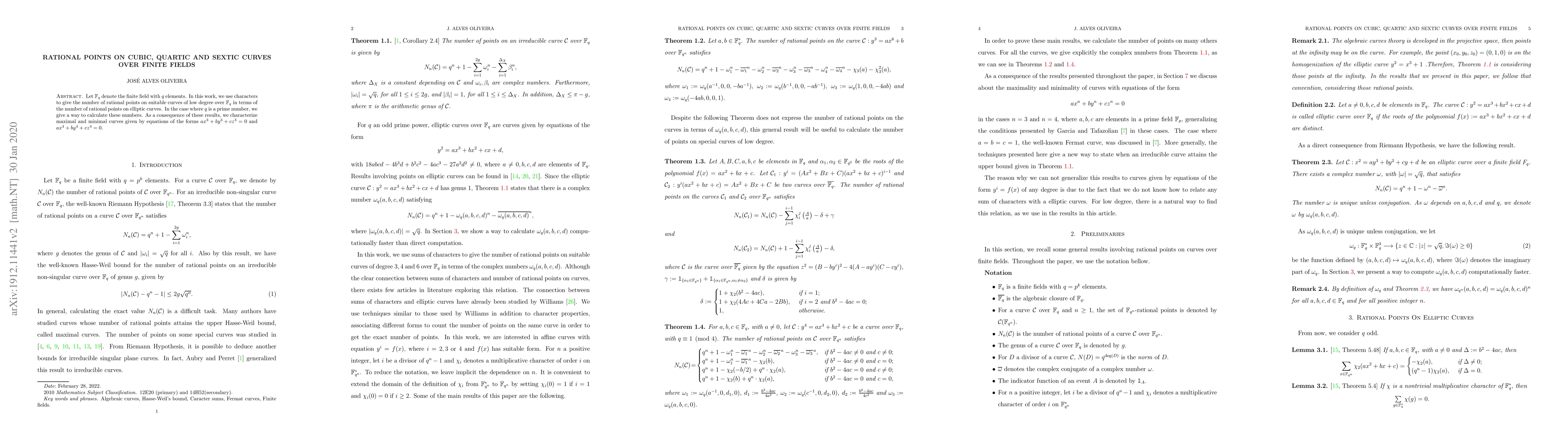 This paper calculates the number of rational points on cubic, quartic, and sextic curves over finite fields using characters and relates these counts to those on elliptic curves. It provides a method for determining these counts when the field size is a prime number and characterizes maximal and minimal curves of specific forms.