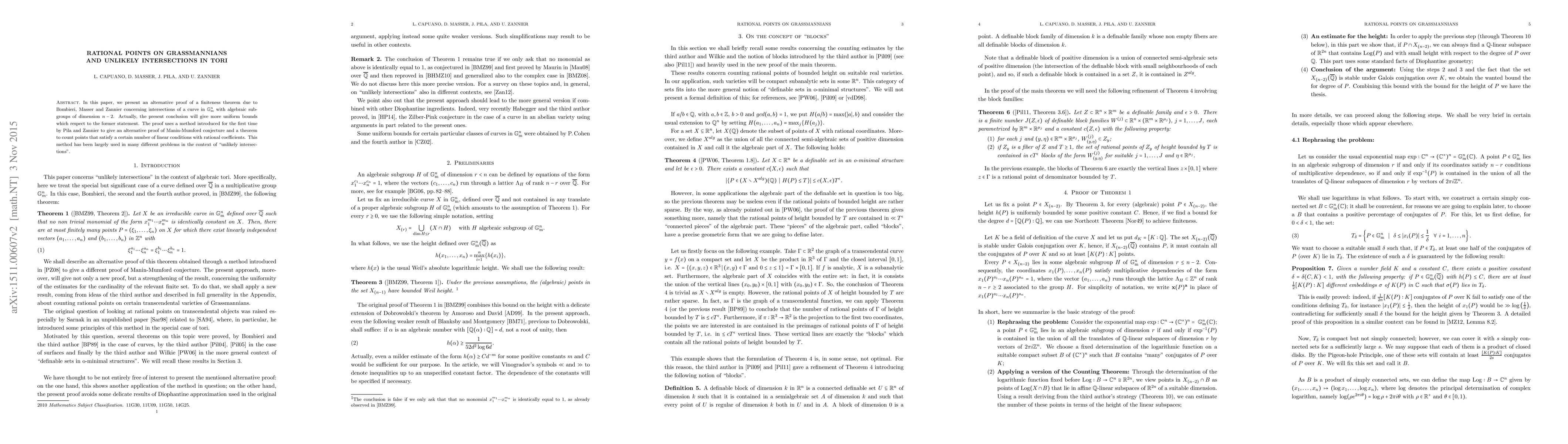In this paper, we present an alternative proof of a finiteness theorem due to Bombieri, Masser and Zannier concerning intersections of a curve in the multiplicative group of dimension n with algebraic subgroups of dimension n-2. The proof uses a method introduced for the first time by Pila and Zannier to give an alternative proof of Manin-Mumford conjecture and a theorem to count points that satisfy a certain number of linear conditions with rational coefficients. This method has been largely used in many different problems in the context of "unlikely intersections".