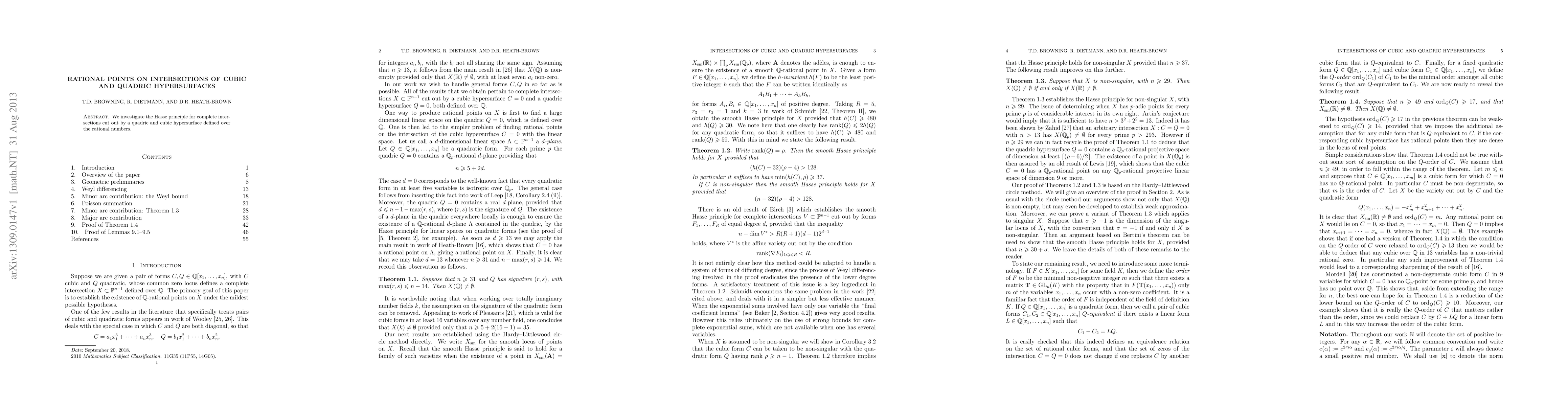 Summary: This study explores the Hasse principle for complete intersections formed by a quadratic and a cubic hypersurface defined over the rationals, focusing on the distribution of rational points on these intersections.