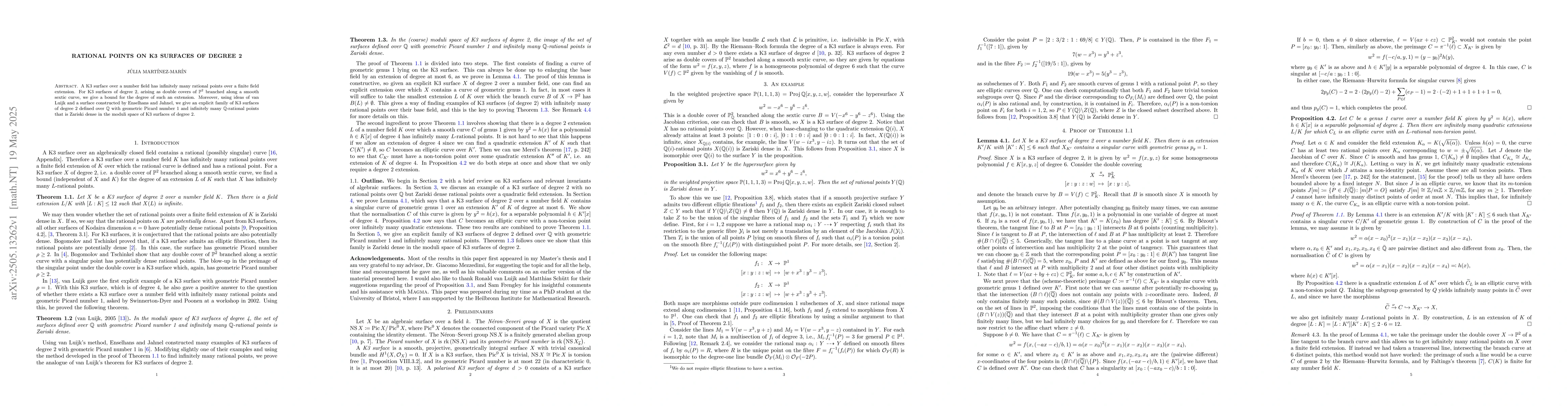 Researchers find a way to bound the degree of field extensions for K3 surfaces of degree 2 and construct a family of such surfaces with infinitely many rational points over the rational numbers.