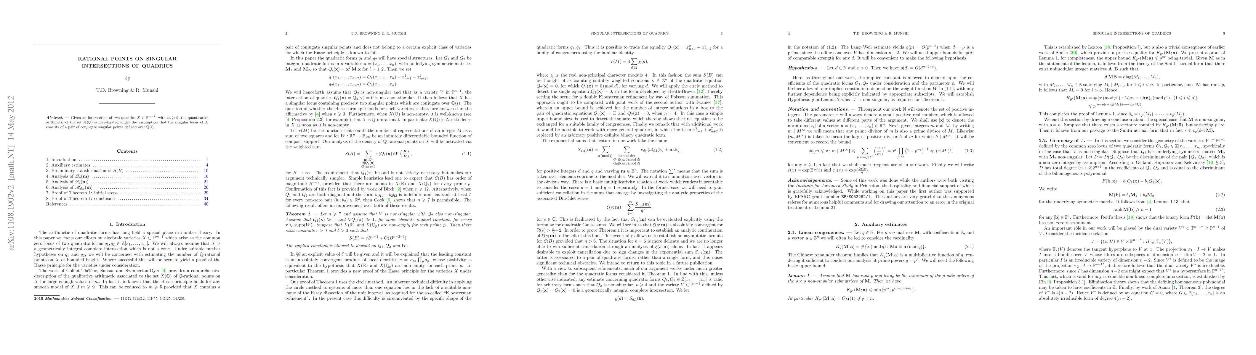 Summary: This paper examines the quantitative behavior of rational points on a projective intersection of two quadrics in at least nine variables, focusing on cases where the intersection contains a pair of conjugate singular points defined over the Gaussians. The study provides insights into the distribution of rational points under these specific conditions.