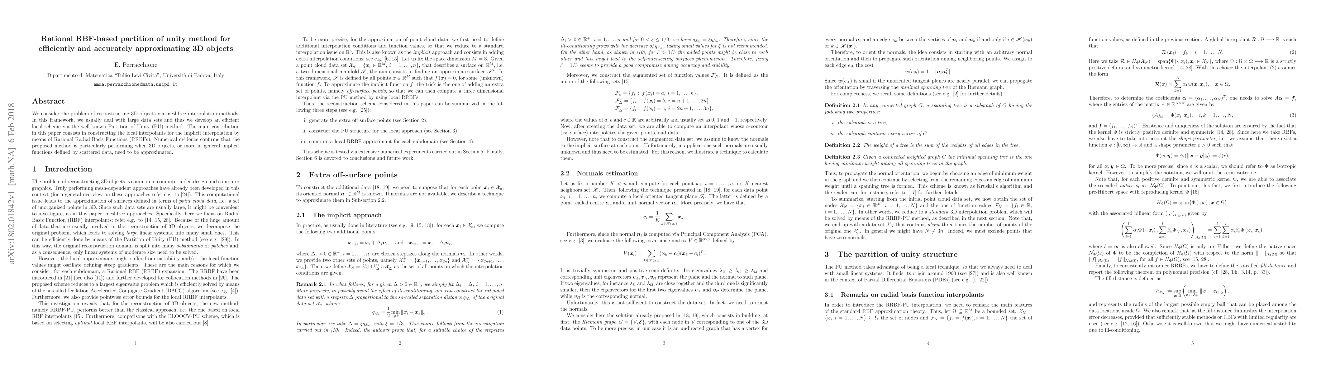 This paper proposes a rational RBF-based partition of unity method for efficiently reconstructing 3D objects using meshfree interpolation. The method constructs local interpolants with Rational Radial Basis Functions, demonstrating superior performance in approximating 3D objects from scattered data.