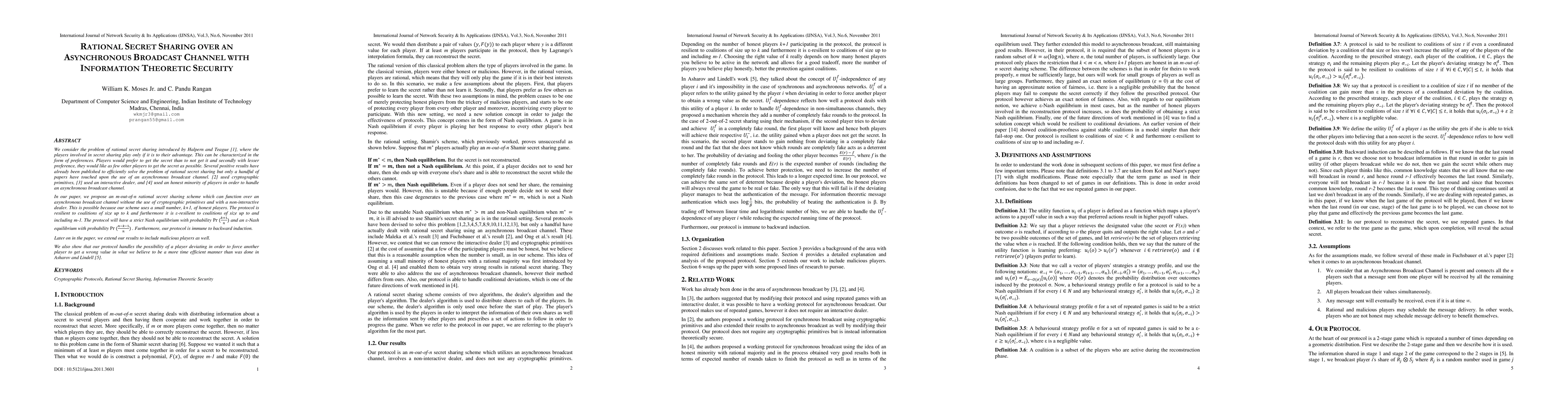 We consider the problem of rational secret sharing introduced by Halpern and Teague [1], where the players involved in secret sharing play only if it is to their advantage. This can be characterized in the form of preferences. Players would prefer to get the secret than to not get it and secondly with lesser preference, they would like as few other players to get the secret as possible. Several positive results have already been published to efficiently solve the problem of rational secret sharing but only a handful of papers have touched upon the use of an asynchronous broadcast channel. [2] used cryptographic primitives, [3] used an interactive dealer, and [4] used an honest minority of players in order to handle an asynchronous broadcast channel. In our paper, we propose an m-out-of-n rational secret sharing scheme which can function over an asynchronous broadcast channel without the use of cryptographic primitives and with a non-interactive dealer. This is possible because our scheme uses a small number, k+1, of honest players. The protocol is resilient to coalitions of size up to k and furthermore it is {\epsilon}-resilient to coalitions of size up to and including m-1. The protocol will have a strict Nash equilibrium with probability Pr((k+1)/n) and an {\epsilon}-Nash equilibrium with probability Pr((n-k-1)/n) . Furthermore, our protocol is immune to backward induction. Later on in the paper, we extend our results to include malicious players as well. We also show that our protocol handles the possibility of a player deviating in order to force another player to get a wrong value in what we believe to be a more time efficient manner than was done in Asharov and Lindell [5].