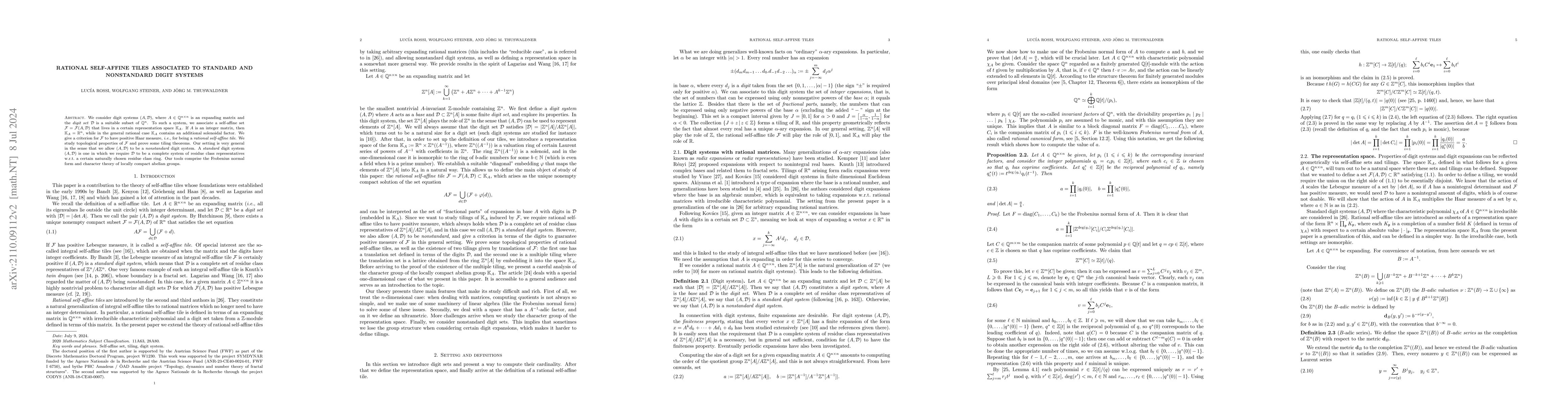 We consider digit systems $(A,\mathcal{D})$, where $ A \in \mathbb{Q}^{n\times n}$ is an expanding matrix and the digit set $\mathcal{D}$ is a suitable subset of $\mathbb{Q}^n$. To such a system, we associate a self-affine set $\mathcal{F} = \mathcal{F}(A,\mathcal{D})$ that lives in a certain representation space $\mathbb{K}$. If $A$ is an integer matrix, then $\mathbb{K} = \mathbb{R}^n$, while in the general rational case $\mathbb{K}$ contains an additional solenoidal factor. We give a criterion for $\mathcal{F}$ to have positive Haar measure, i.e., for being a rational self-affine tile. We study topological properties of $\mathcal{F}$ and prove some tiling theorems. Our setting is very general in the sense that we allow $(A,\mathcal{D})$ to be a nonstandard digit system. A standard digit system $(A,\mathcal{D})$ is one in which we require $\mathcal{D}$ to be a complete system of residue class representatives w.r.t. a certain naturally chosen residue class ring. Our tools comprise the Frobenius normal form and character theory of locally compact abelian groups.
