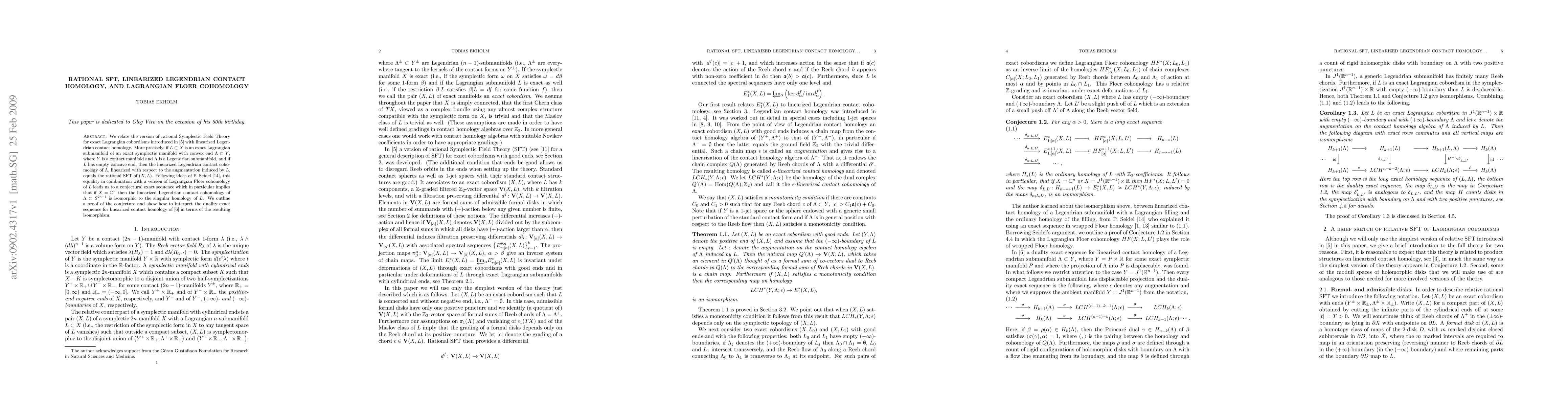 We relate the version of rational Symplectic Field Theory for exact Lagrangian cobordisms introduced in [5] with linearized Legendrian contact homology. More precisely, if $L\subset X$ is an exact Lagrangian submanifold of an exact symplectic manifold with convex end $\Lambda\subset Y$, where $Y$ is a contact manifold and $\Lambda$ is a Legendrian submanifold, and if $L$ has empty concave end, then the linearized Legendrian contact cohomology of $\Lambda$, linearized with respect to the augmentation induced by $L$, equals the rational SFT of $(X,L)$. Following ideas of P. Seidel, this equality in combination with a version of Lagrangian Floer cohomology of $L$ leads us to a conjectural exact sequence which in particular implies that if $X=\C^{n}$ then the linearized Legendrian contact cohomology of $\Lambda\subset S^{2n-1}$ is isomorphic to the singular homology of $L$. We outline a proof of the conjecture and show how to interpret the duality exact sequence for linearized contact homology of [6] in terms of the resulting isomorphism.