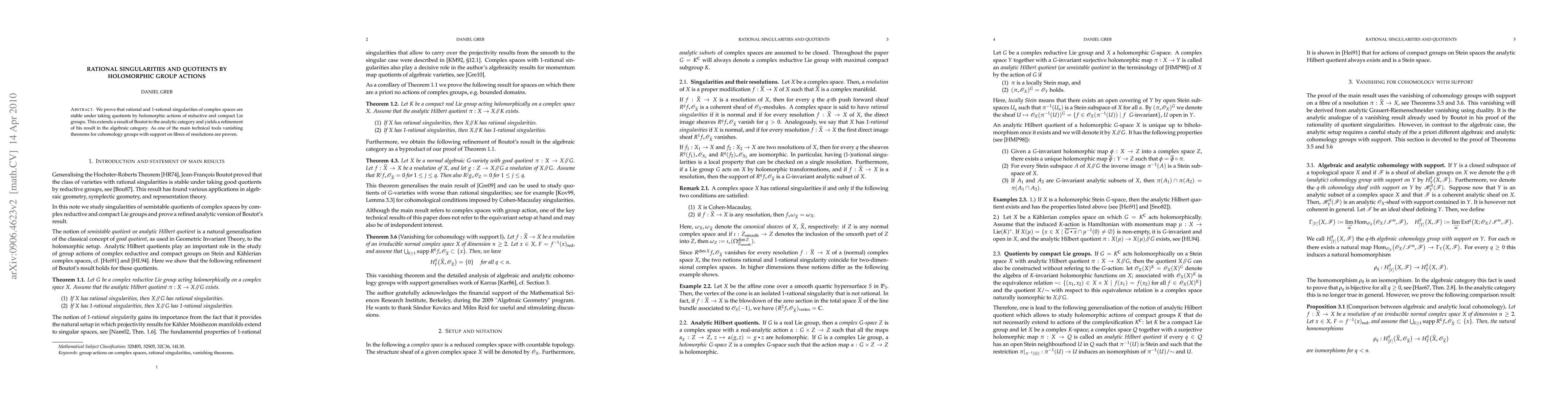 Summary: The paper demonstrates that rational singularities in complex spaces remain stable under quotients by holomorphic actions of reductive and compact Lie groups, extending previous algebraic results. The study employs vanishing theorems for cohomology groups to support this stability.