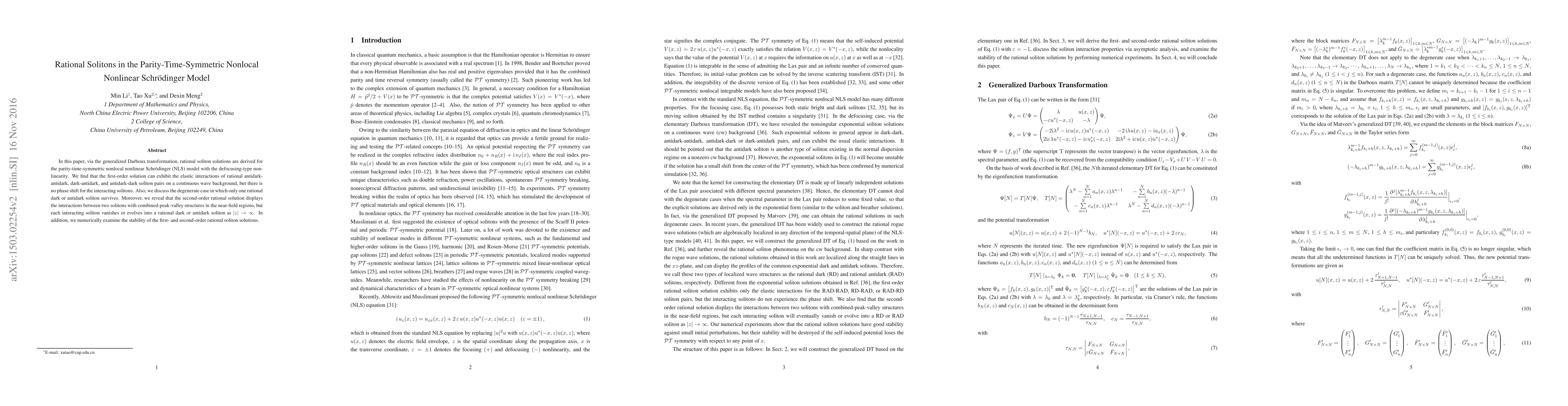 This paper derives rational soliton solutions for the parity-time-symmetric nonlocal nonlinear Schrödinger model using generalized Darboux transformation, revealing elastic interactions without phase shifts and analyzing stability. It also discusses degenerate cases and interactions with combined-peak-valley structures in higher-order solutions.