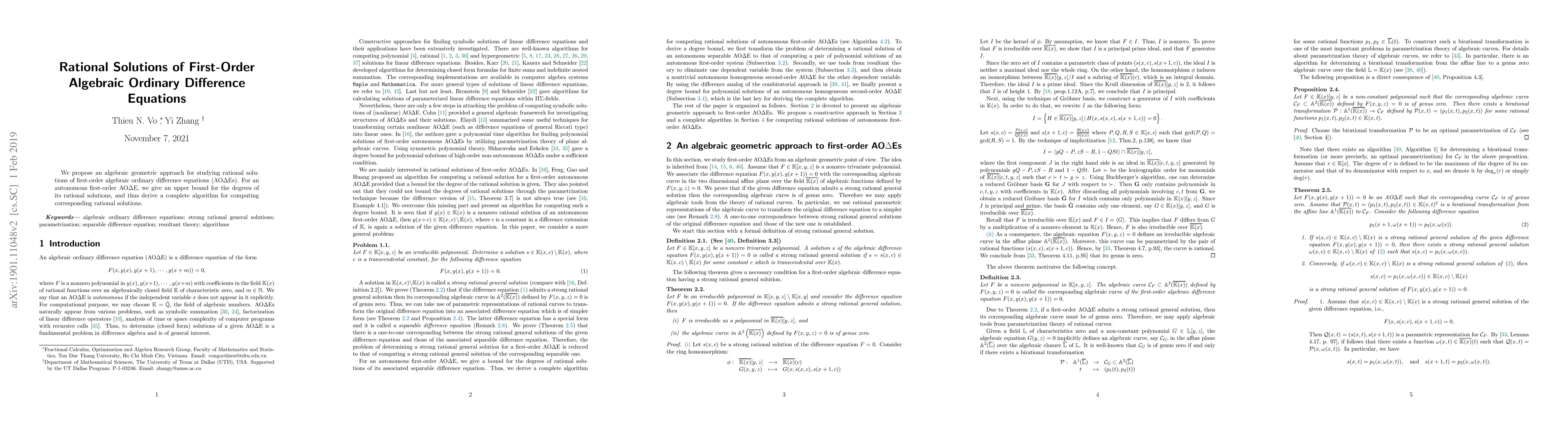 Summary: This paper presents an algebraic geometric method to analyze rational solutions for first-order algebraic ordinary difference equations, providing an upper bound on the degrees of these solutions and a comprehensive algorithm for computing them.