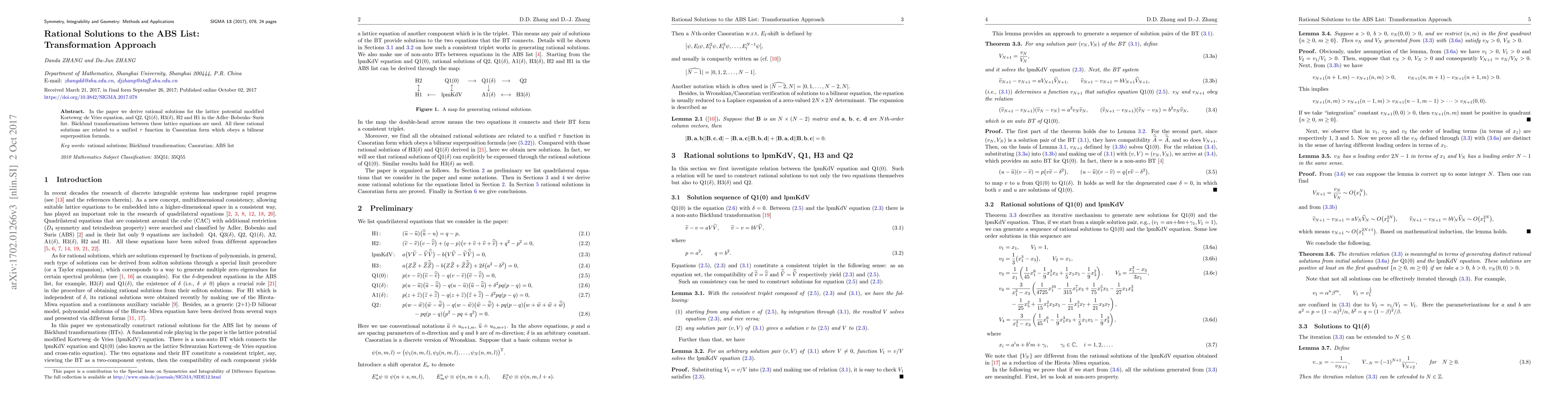 In the paper we derive rational solutions for the lattice potential modified Korteweg-de Vries equation, and Q2, Q1($\delta$), H3($\delta$), H2 and H1 in the Adler-Bobenko-Suris list. B\"acklund transformations between these lattice equations are used. All these rational solutions are related to a unified $\tau$ function in Casoratian form which obeys a bilinear superposition formula.