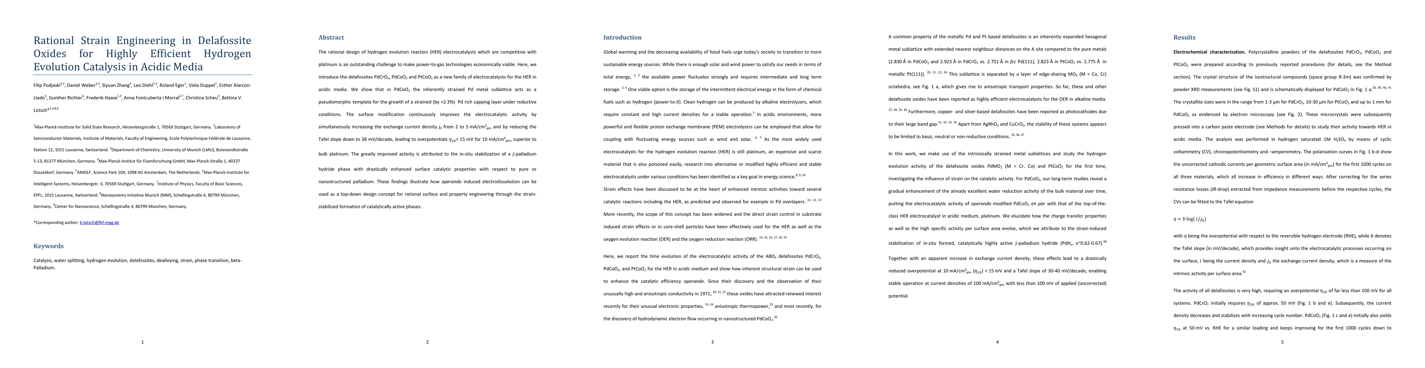 This paper introduces delafossite oxides PdCrO$_2$, PdCoO$_2$, and PtCoO$_2$ as efficient electrocatalysts for hydrogen evolution in acidic media. PdCoO$_2$'s strained Pd sublattice induces a Pd-rich capping layer, enhancing catalytic activity and achieving overpotentials < 15 mV for 10 mA/cm$^2_{geo}$, surpassing bulk platinum, due to the stabilization of a $\beta$-palladium hydride phase.