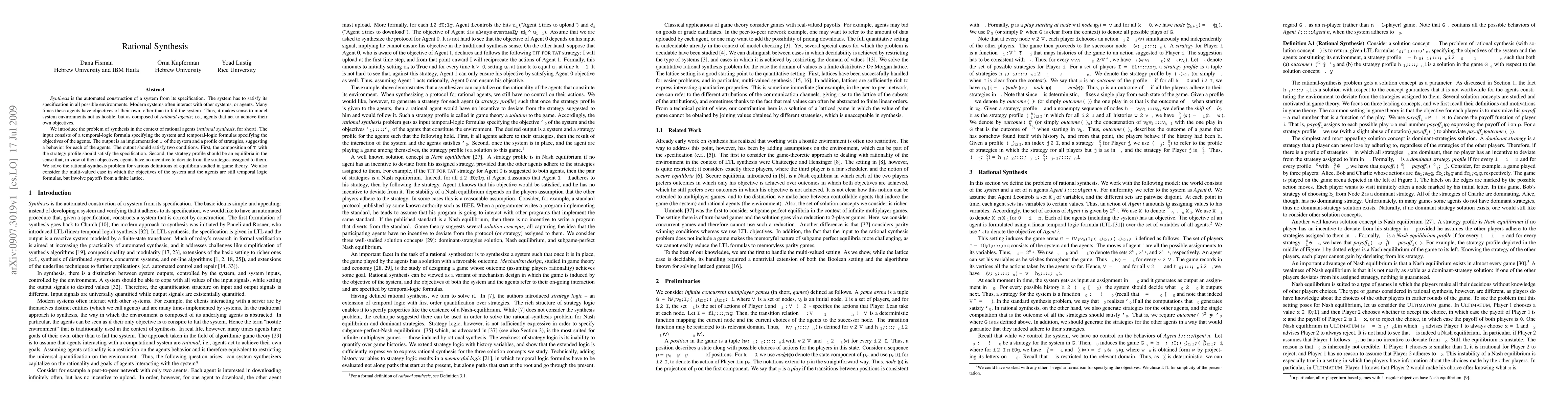 Synthesis is the automated construction of a system from its specification. The system has to satisfy its specification in all possible environments. Modern systems often interact with other systems, or agents. Many times these agents have objectives of their own, other than to fail the system. Thus, it makes sense to model system environments not as hostile, but as composed of rational agents; i.e., agents that act to achieve their own objectives. We introduce the problem of synthesis in the context of rational agents (rational synthesis, for short). The input consists of a temporal-logic formula specifying the system and temporal-logic formulas specifying the objectives of the agents. The output is an implementation T of the system and a profile of strategies, suggesting a behavior for each of the agents. The output should satisfy two conditions. First, the composition of T with the strategy profile should satisfy the specification. Second, the strategy profile should be an equilibria in the sense that, in view of their objectives, agents have no incentive to deviate from the strategies assigned to them. We solve the rational-synthesis problem for various definitions of equilibria studied in game theory. We also consider the multi-valued case in which the objectives of the system and the agents are still temporal logic formulas, but involve payoffs from a finite lattice.