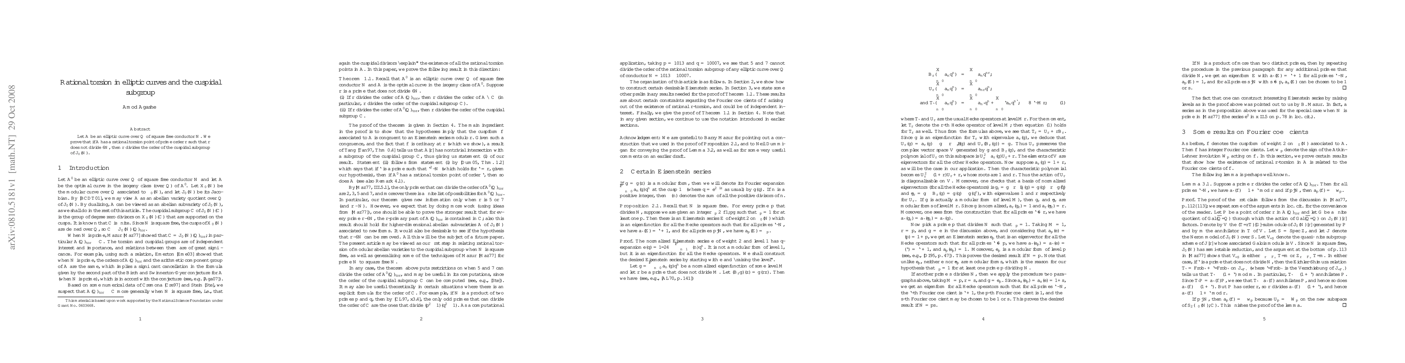 Summary: The paper proves that if an elliptic curve $A$ over $\Q$ with square-free conductor $N$ has a rational torsion point of prime order $r$ not dividing $6N$, then $r$ must divide the order of the cuspidal subgroup of $J_0(N)$. This establishes a connection between rational torsion points and the cuspidal subgroup.
