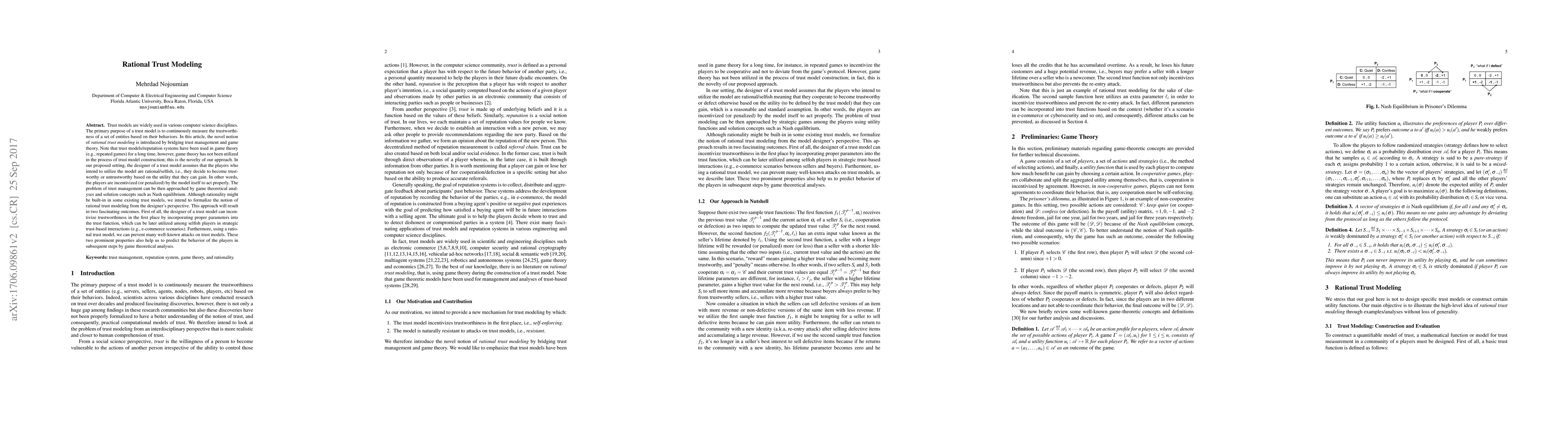 This paper introduces "rational trust modeling," a novel approach that combines trust management with game theory to design trust models that assume players are rational and self-interested. The proposed model incentivizes trustworthy behavior and can prevent attacks, while also enabling game theoretical predictions of player behavior.