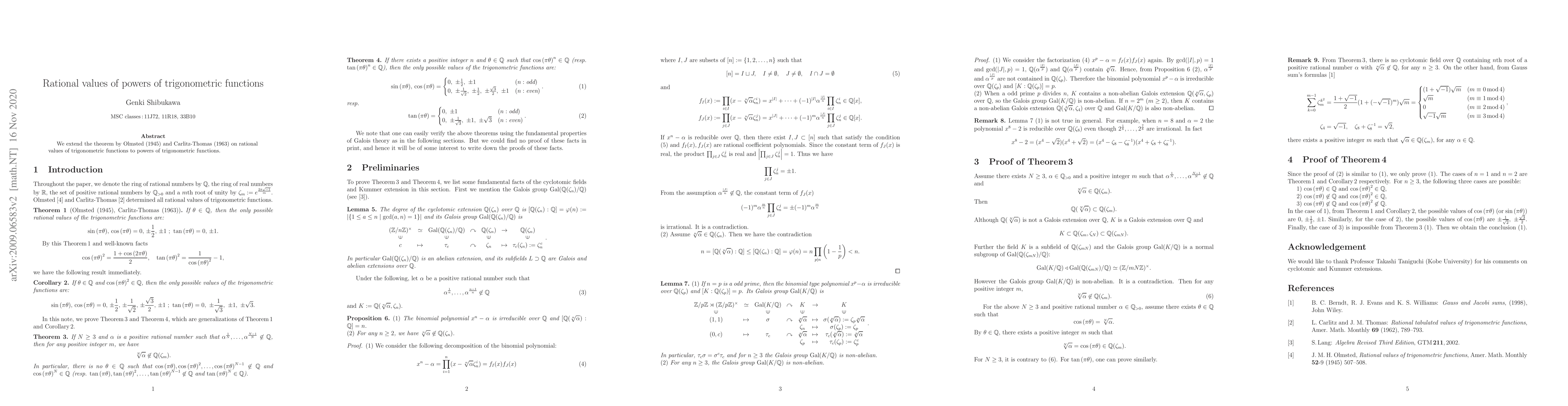 Summary: This paper extends previous theorems on rational values of trigonometric functions to include rational values of their powers, building on the work of Olmsted and Carlitz-Thomas. The study aims to generalize the understanding of when powers of trigonometric functions can yield rational numbers.