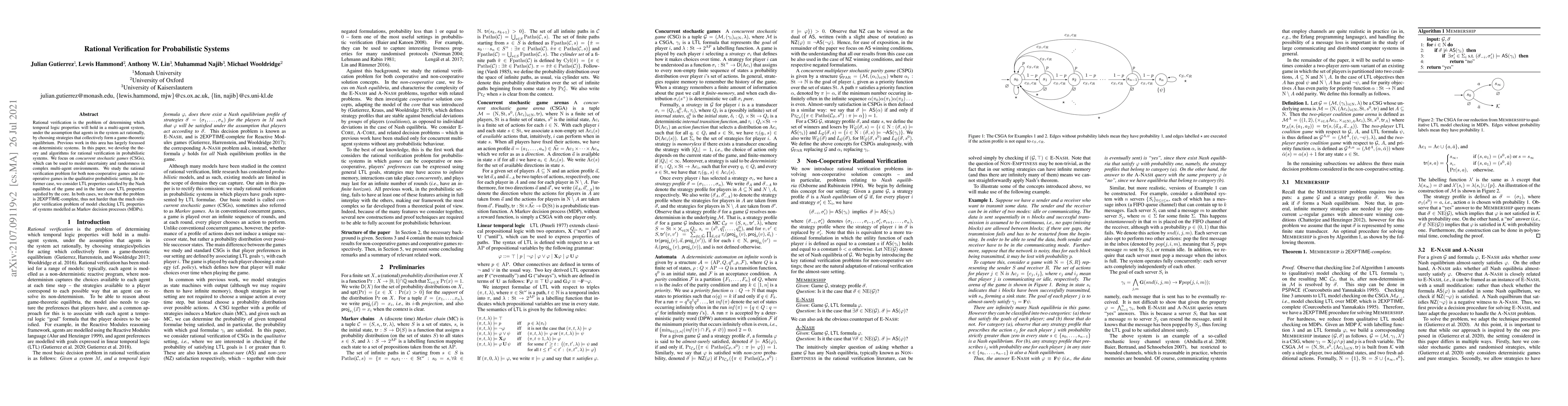 This paper develops theory and algorithms for rational verification in probabilistic systems, specifically concurrent stochastic games (CSGs). It addresses the 2EXPTIME-complete problem of determining temporal logic properties under rational agent strategies, showing it is no harder than verifying Markov decision processes.