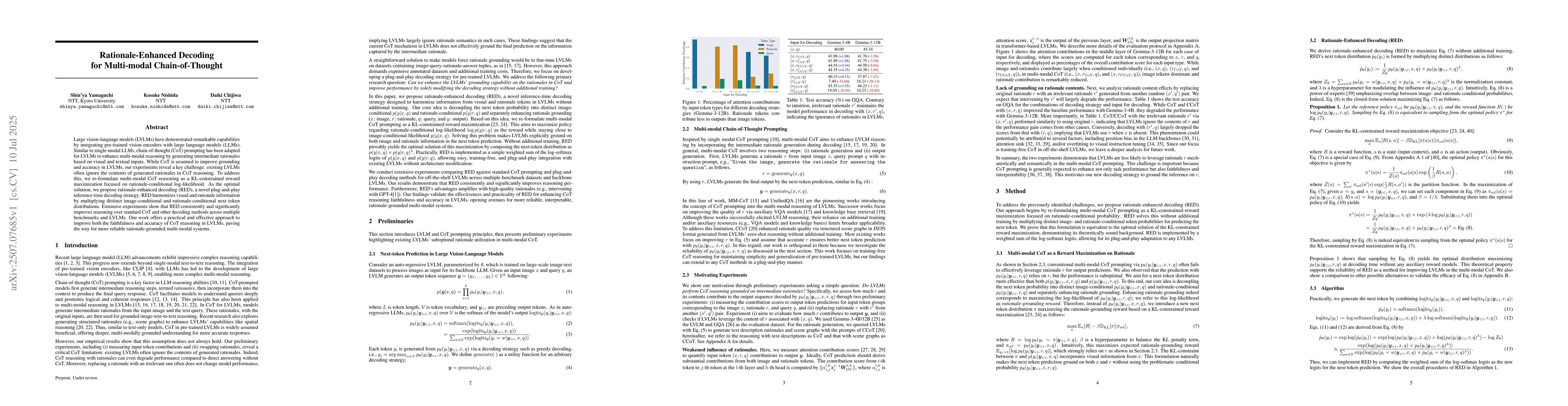 Large vision-language models (LVLMs) have demonstrated remarkable capabilities by integrating pre-trained vision encoders with large language models (LLMs). Similar to single-modal LLMs, chain-of-thought (CoT) prompting has been adapted for LVLMs to enhance multi-modal reasoning by generating intermediate rationales based on visual and textual inputs. While CoT is assumed to improve grounding and accuracy in LVLMs, our experiments reveal a key challenge: existing LVLMs often ignore the contents of generated rationales in CoT reasoning. To address this, we re-formulate multi-modal CoT reasoning as a KL-constrained reward maximization focused on rationale-conditional log-likelihood. As the optimal solution, we propose rationale-enhanced decoding (RED), a novel plug-and-play inference-time decoding strategy. RED harmonizes visual and rationale information by multiplying distinct image-conditional and rationale-conditional next token distributions. Extensive experiments show that RED consistently and significantly improves reasoning over standard CoT and other decoding methods across multiple benchmarks and LVLMs. Our work offers a practical and effective approach to improve both the faithfulness and accuracy of CoT reasoning in LVLMs, paving the way for more reliable rationale-grounded multi-modal systems.