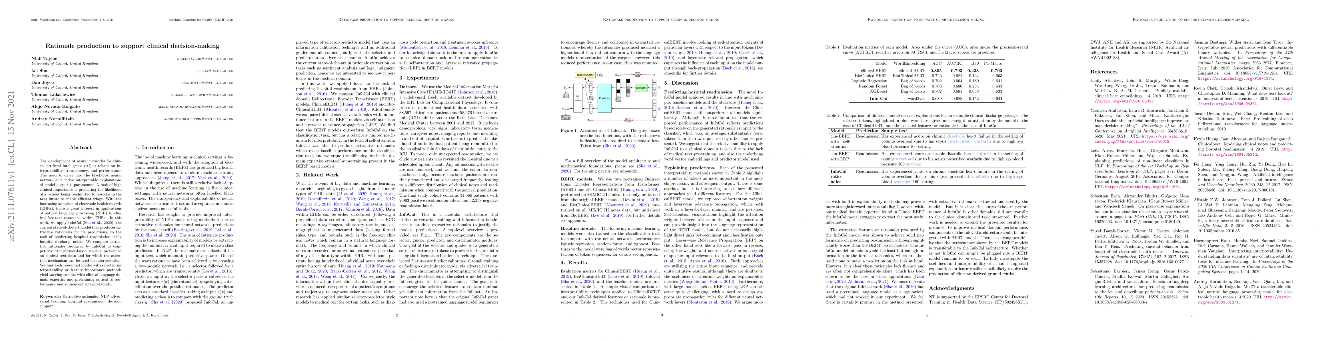 The development of neural networks for clinical artificial intelligence (AI) is reliant on interpretability, transparency, and performance. The need to delve into the black-box neural network and derive interpretable explanations of model output is paramount. A task of high clinical importance is predicting the likelihood of a patient being readmitted to hospital in the near future to enable efficient triage. With the increasing adoption of electronic health records (EHRs), there is great interest in applications of natural language processing (NLP) to clinical free-text contained within EHRs. In this work, we apply InfoCal, the current state-of-the-art model that produces extractive rationales for its predictions, to the task of predicting hospital readmission using hospital discharge notes. We compare extractive rationales produced by InfoCal to competitive transformer-based models pretrained on clinical text data and for which the attention mechanism can be used for interpretation. We find each presented model with selected interpretability or feature importance methods yield varying results, with clinical language domain expertise and pretraining critical to performance and subsequent interpretability.