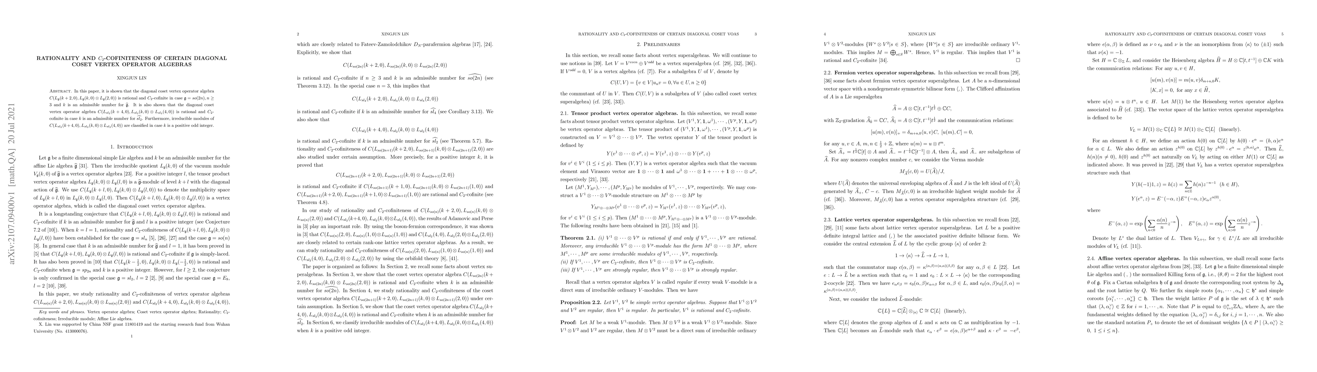 In this paper, it is shown that the diagonal coset vertex operator algebra $C(L_{\mathfrak{g}}(k+2,0),L_{\mathfrak{g}}(k,0)\otimes L_{\mathfrak{g}}(2,0))$ is rational and $C_2$-cofinite in case $\mathfrak{g}=so(2n), n\geq 3$ and $k$ is an admissible number for $\hat{\mathfrak{g}}$. It is also shown that the diagonal coset vertex operator algebra $C(L_{sl_2}(k+4,0),L_{sl_2}(k,0)\otimes L_{sl_2}(4,0))$ is rational and $C_2$-cofinite in case $k$ is an admissible number for $\hat{sl_2}$. Furthermore, irreducible modules of $C(L_{sl_2}(k+4,0),L_{sl_2}(k,0)\otimes L_{sl_2}(4,0))$ are classified in case $k$ is a positive odd integer.