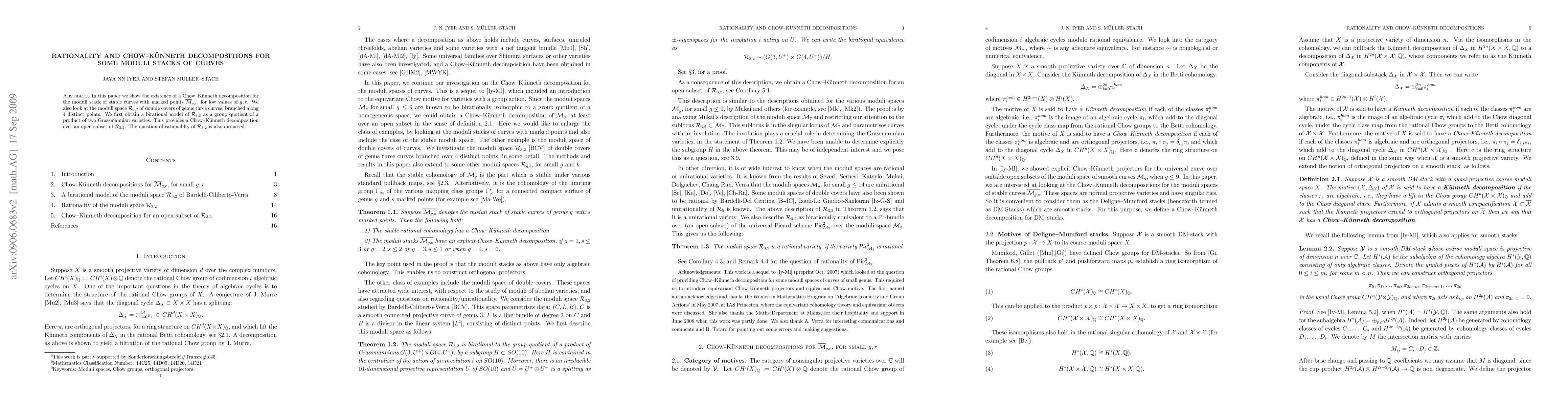 In this paper, we show the existence of a Chow--Kuenneth decomposition for the moduli stack of stable curves of genus g with r marked points, for low values of g,r. We also look at the moduli space R of double covers of genus 3 curves, branched along 4 distinct points. We obtain a birational model of the moduli space R as a group quotient of a product of two Grassmanian varieties. This provides a Chow-Kuenneth decomposition over an open subset of R. The question of rationality of R is also discussed.