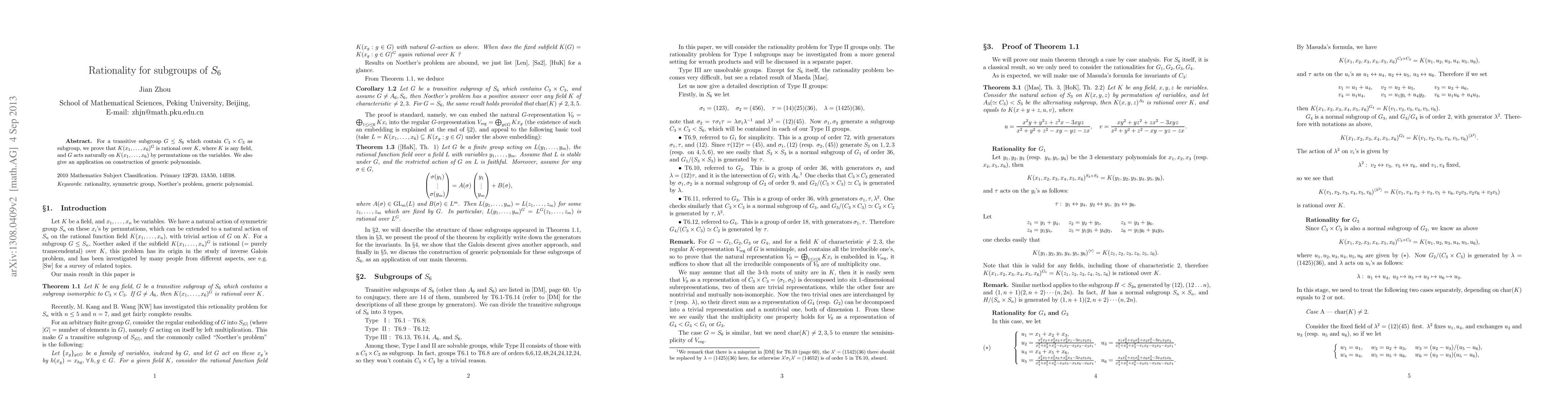 For a transitive subgroup $G \le S_6$ which contain $C_3 \times C_3$ as subgroup, we prove that $K(x_1,\dots,x_6)^G$ is rational over $K$, where $K$ is any field, and $G$ acts naturally on $K(x_1,\dots,x_6)$ by permutations on the variables. We also give an application on construction of generic polynomials.