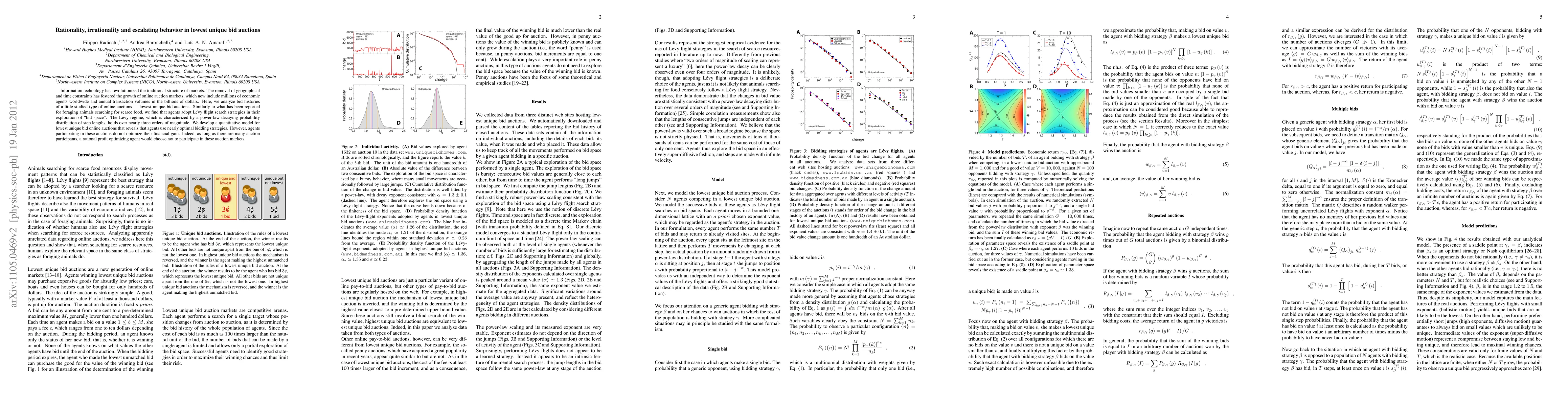This paper examines the behavior of participants in lowest unique bid online auctions, finding that they employ Levy flight search strategies. Despite nearly optimal bidding strategies, participants do not maximize financial gain, and rational agents may avoid these auctions due to the presence of many competitors.