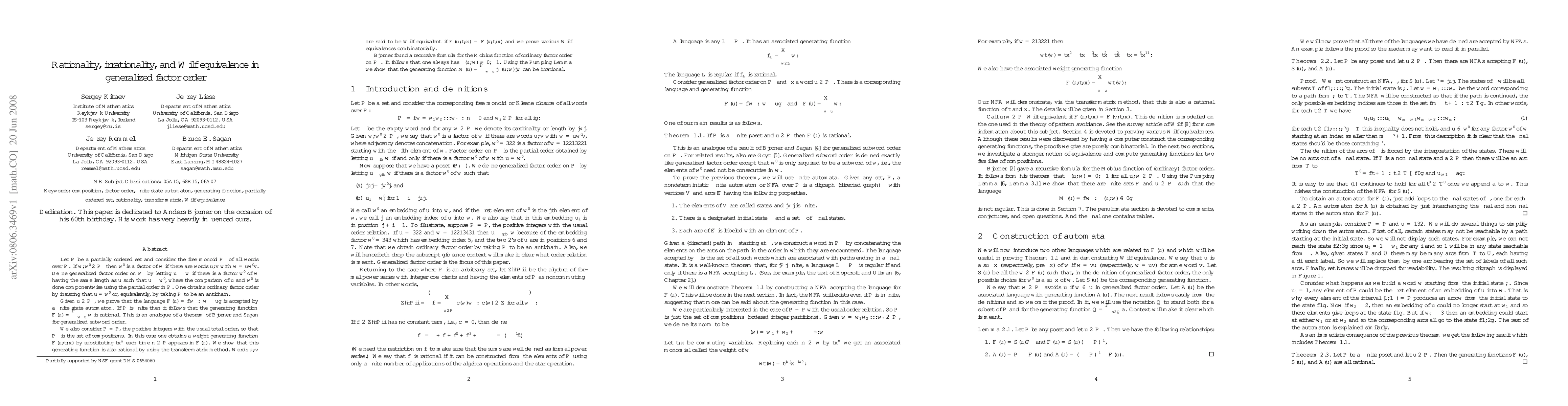 Let $P$ be a partially ordered set and consider the free monoid $P^*$ of all words over $P$. If $w,w'\in P^*$ then $w'$ is a factor of $w$ if there are words $u,v$ with $w=uw'v$. Define generalized factor order on $P^*$ by letting $u\le w$ if there is a factor $w'$ of $w$ having the same length as $u$ such that $u\le w'$, where the comparison of $u$ and $w'$ is done componentwise using the partial order in $P$. One obtains ordinary factor order by insisting that $u=w'$ or, equivalently, by taking $P$ to be an antichain. Given $u\in P^*$, we prove that the language $\cF(u)=\{w : w\ge u\}$ is accepted by a finite state automaton. If $P$ is finite then it follows that the generating function $F(u)=\sum_{w\ge u} w$ is rational. This is an analogue of a theorem of Bj\"orner and Sagan for generalized subword order. We also consider $P=\bbP$, the positive integers with the usual total order, so that $P^*$ is the set of compositions. In this case one obtains a weight generating function $F(u;t,x)$ by substituting $tx^n$ each time $n\in\bbP$ appears in $F(u)$. We show that this generating function is also rational by using the transfer-matrix method. Words $u,v$ are said to be Wilf equivalent if $F(u;t,x)=F(v;t,x)$ and we prove various Wilf equivalences combinatorially. Bj\"orner found a recursive formula for the M\"obius function of ordinary factor order on $P^*$. It follows that one always has $\mu(u,w)=0,\pm1$. Using the Pumping Lemma we show that the generating function $M(u)=\sum_{w\ge u} |\mu(u,w)| w$ can be irrational.