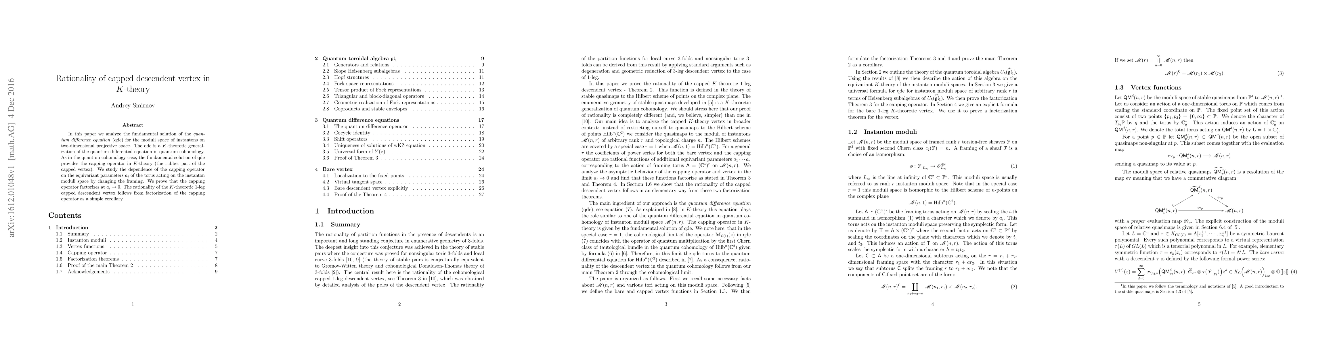 In this paper we analyze the fundamental solution of the \textit{quantum difference equation} (qde) for the moduli space of instantons on two-dimensional projective space. The qde is a $K$-theoretic generalization of the quantum differential equation in quantum cohomology. As in the quantum cohomology case, the fundamental solution of qde provides the capping operator in $K$-theory (the rubber part of the capped vertex). We study the dependence of the capping operator on the equivariant parameters $a_i$ of the torus acting on the instanton moduli space by changing the framing. We prove that the capping operator factorizes at $a_i\to 0$. The rationality of the $K$-theoretic 1-leg capped descendent vertex follows from factorization of the capping operator as a simple corollary.