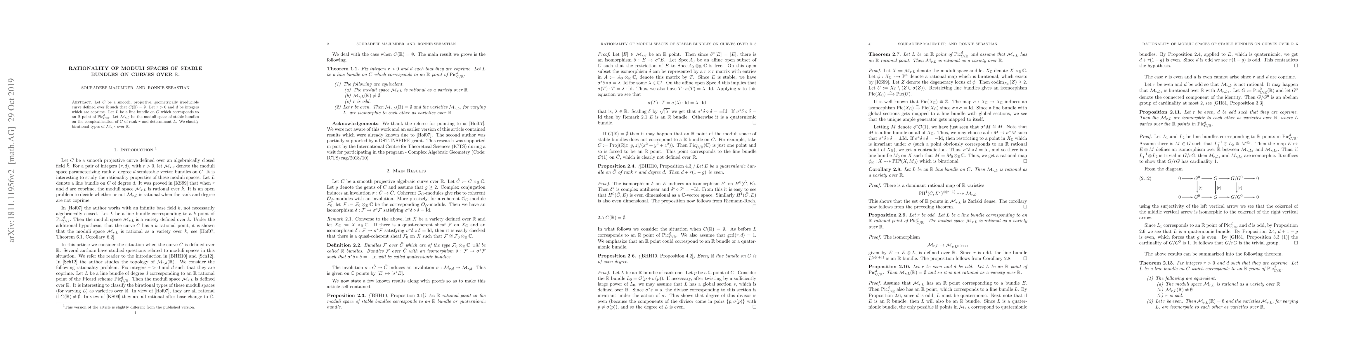 Let $C$ be a smooth, projective, geometrically irreducible curve defined over $\mathbb{R}$ such that $C(\mathbb{R}) = \emptyset$. Let $r>0$ and $d$ be integers which are coprime. Let $L$ be a line bundle on $C$ which corresponds to an $\mathbb{R}$ point of ${\rm Pic}^d_{C/\mathbb{R}}$. Let $\mathcal{M}_{r,L}$ be the moduli space of stable bundles on the complexification of $C$ of rank $r$ and determinant $L$. We classify birational types of $\mathcal{M}_{r,L}$ over $\mathbb{R}$.