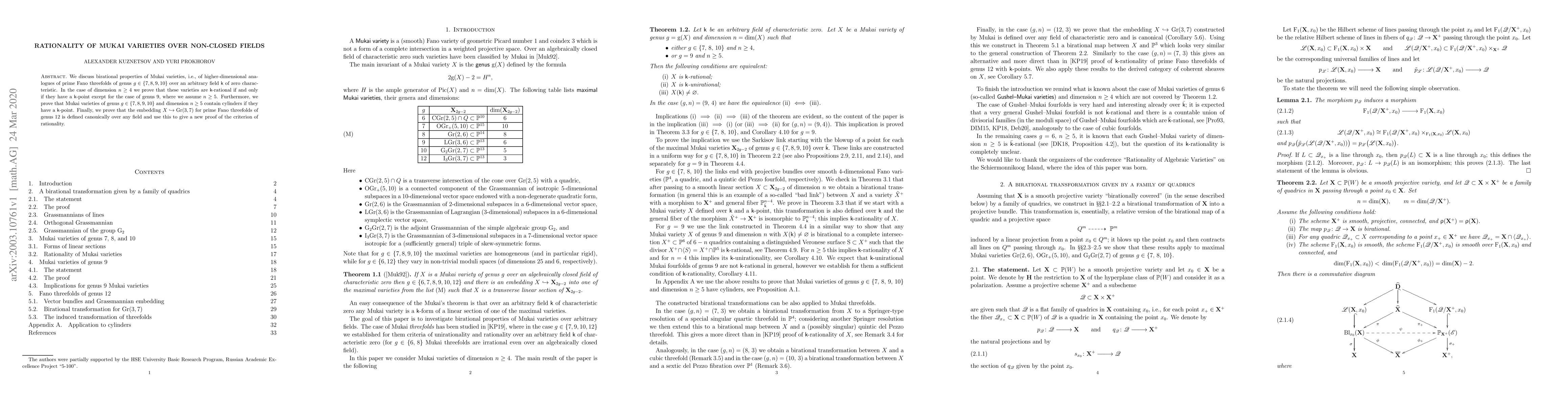 We discuss birational properties of Mukai varieties, i.e., of higher-dimensional analogues of prime Fano threefolds of genus $g \in \{7,8,9,10\}$ over an arbitrary field $\mathsf{k}$ of zero characteristic. In the case of dimension $n \ge 4$ we prove that these varieties are $\mathsf{k}$-rational if and only if they have a $\mathsf{k}$-point except for the case of genus $9$, where we assume $n \ge 5$. Furthermore, we prove that Mukai varieties of genus $g \in \{7,8,9,10\}$ and dimension $n \ge 5$ contain cylinders if they have a $\mathsf{k}$-point. Finally, we prove that the embedding $X \hookrightarrow \mathrm{Gr}(3,7)$ for prime Fano threefolds of genus $12$ is defined canonically over any field and use this to give a new proof of the criterion of rationality.