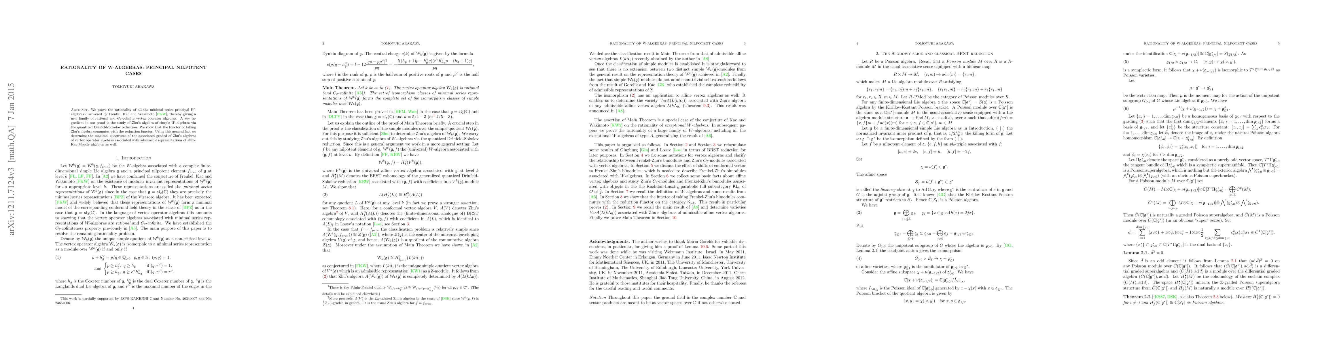We prove the rationality of all the minimal series principal W-algebras discovered by Frenkel, Kac and Wakimoto in 1992, thereby giving a new family of rational and C_2-cofinite vertex operator algebras. A key ingredient in our proof is the study of Zhu's algebra of simple W-algebras via the quantized Drinfeld-Sokolov reduction. We show that the functor of taking Zhu's algebra commutes with the reduction functor. Using this general fact we determine the maximal spectrums of the associated graded of Zhu's algebra of all the admissible affine vertex algebras as well.