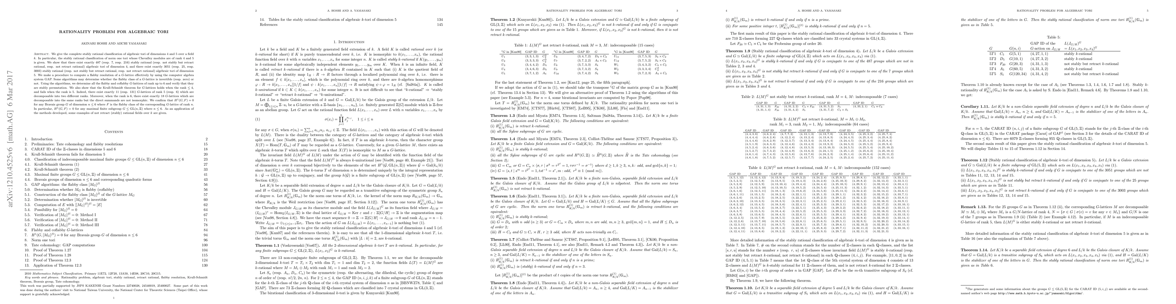 We give the complete stably rational classification of algebraic tori of dimensions $4$ and $5$ over a field $k$. In particular, the stably rational classification of norm one tori whose Chevalley modules are of rank $4$ and $5$ is given. We show that there exist exactly $487$ (resp. $7$, resp. $216$) stably rational (resp. not stably but retract rational, resp. not retract rational) algebraic tori of dimension $4$, and there exist exactly $3051$ (resp. $25$, resp. $3003$) stably rational (resp. not stably but retract rational, resp. not retract rational) algebraic tori of dimension $5$. We make a procedure to compute a flabby resolution of a $G$-lattice effectively by using the computer algebra system GAP. Some algorithms may determine whether the flabby class of a $G$-lattice is invertible (resp. zero) or not. Using the algorithms, we determine all the flabby and coflabby $G$-lattices of rank up to $6$ and verify that they are stably permutation. We also show that the Krull-Schmidt theorem for $G$-lattices holds when the rank $\leq 4$, and fails when the rank is $5$. Indeed, there exist exactly $11$ (resp. $131$) $G$-lattices of rank $5$ (resp. $6$) which are decomposable into two different ranks. Moreover, when the rank is $6$, there exist exactly $18$ $G$-lattices which are decomposable into the same ranks but the direct summands are not isomorphic. We confirm that $H^1(G,F)=0$ for any Bravais group $G$ of dimension $n\leq 6$ where $F$ is the flabby class of the corresponding $G$-lattice of rank $n$. In particular, $H^1(G,F)=0$ for any maximal finite subgroup $G\leq {\rm GL}(n,\mathbb{Z})$ where $n\leq 6$. As an application of the methods developed, some examples of not retract (stably) rational fields over $k$ are given.