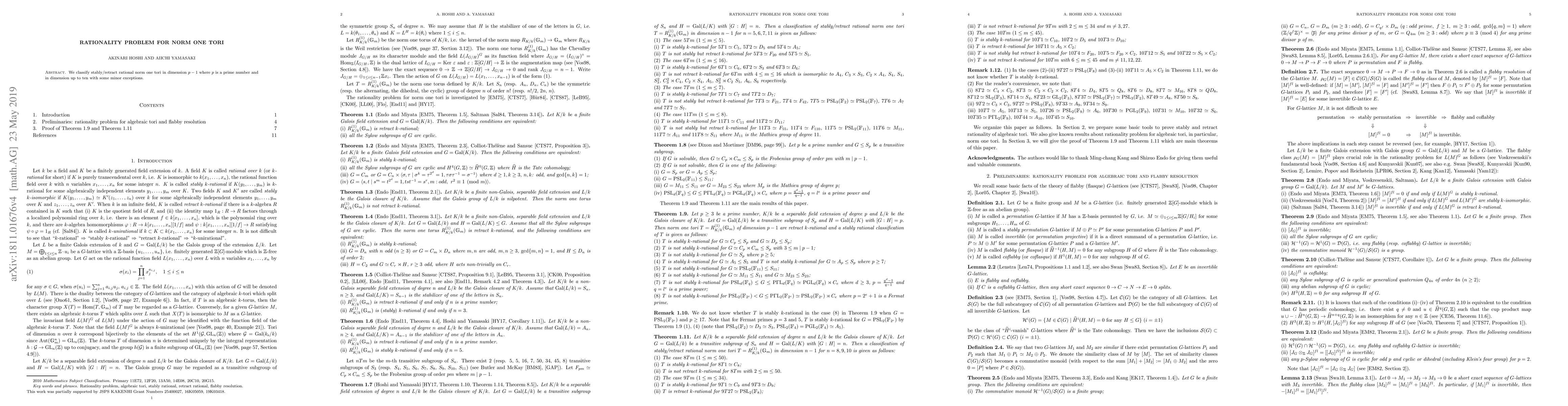We classify stably/retract rational norm one tori in dimension $p-1$ where $p$ is a prime number and in dimension up to ten with some minor exceptions.