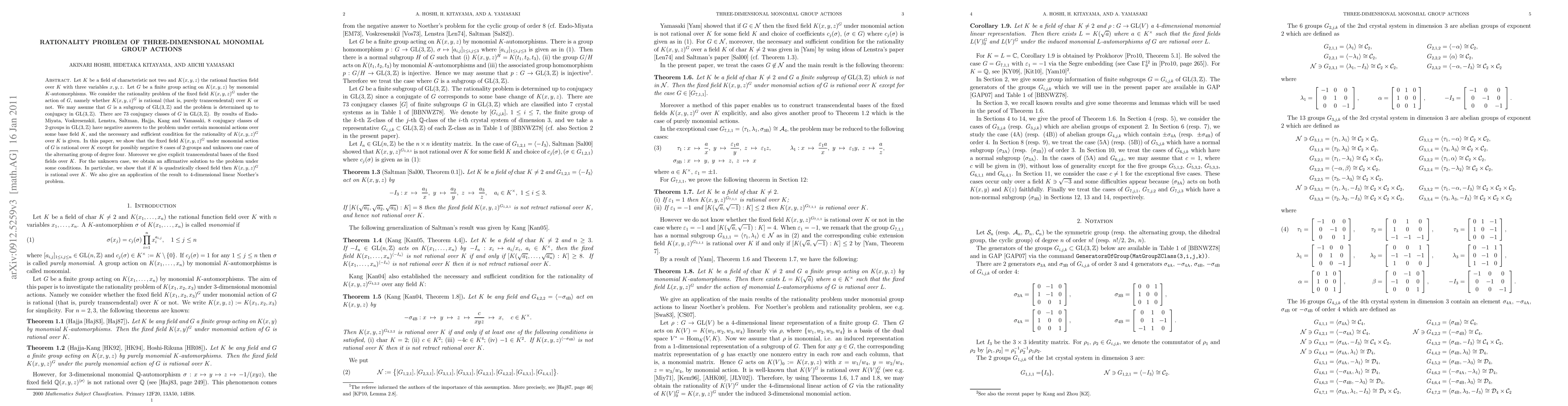 Let $K$ be a field of characteristic not two and $K(x,y,z)$ the rational function field over $K$ with three variables $x,y,z$. Let $G$ be a finite group of acting on $K(x,y,z)$ by monomial $K$-automorphisms. We consider the rationality problem of the fixed field $K(x,y,z)^G$ under the action of $G$, namely whether $K(x,y,z)^G$ is rational (that is, purely transcendental) over $K$ or not. We may assume that $G$ is a subgroup of $\mathrm{GL}(3,\mathbb{Z}) and the problem is determined up to conjugacy in $\mathrm{GL}(3,\mathbb{Z})$. There are 73 conjugacy classes of $G$ in $\mathrm{GL}(3,\mathbb{Z})$. By results of Endo-Miyata, Voskresenski\u\i, Lenstra, Saltman, Hajja, Kang and Yamasaki, 8 conjugacy classes of 2-groups in $\mathrm{GL}(3,\mathbb{Z})$ have negative answers to the problem under certain monomial actions over some base field $K$, and the necessary and sufficient condition for the rationality of $K(x,y,z)^G$ over $K$ is given. In this paper, we show that the fixed field $K(x,y,z)^G$ under monomial action of $G$ is rational over $K$ except for possibly negative 8 cases of 2-groups and unknown one case of the alternating group of degree four. Moreover we give explicit transcendental bases of the fixed fields over $K$. For unknown case, we obtain an affirmative solution to the problem under some conditions. In particular, we show that if $K$ is quadratically closed field then $K(x,y,z)^G$ is rational over $K$. We also give an application of the result to 4-dimensional linear Noether's problem.