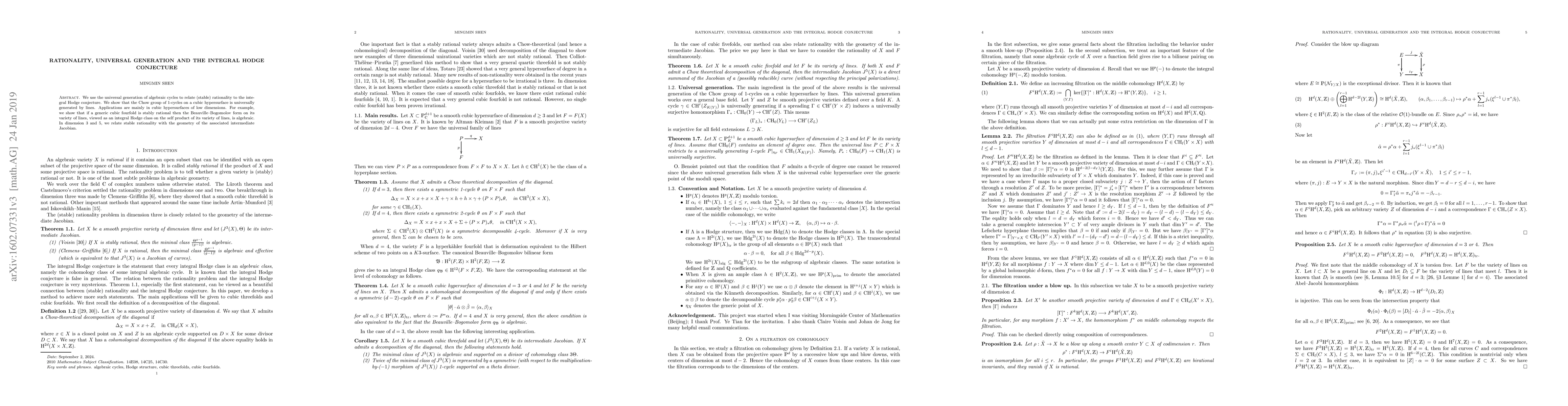 We use the universal generation of algebraic cycles to relate (stable) rationality to the integral Hodge conjecture. We show that the Chow group of 1-cycles on a cubic hypersurface is universally generated by lines. Applications are mainly in cubic hypersurfaces of low dimensions. For example, we show that if a generic cubic fourfold is stably rational then the Beauville--Bogomolov form on its variety of lines, viewed as an integral Hodge class on the self product of its variety of lines, is algebraic. In dimension $3$ and $5$, we relate stable rationality with the geometry of the associated intermediate Jacobian.
