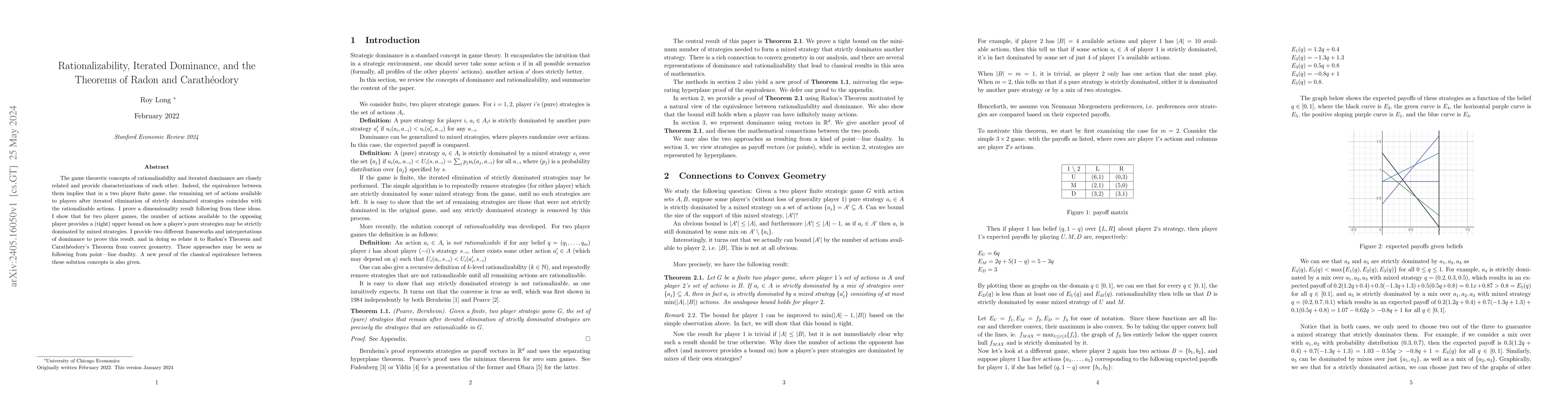 This paper examines the equivalence of rationalizability and iterated dominance in two-player finite games, proving that strictly dominated strategies can be eliminated through both frameworks. It establishes a dimensionality result linking the number of a player's actions to the extent of domination by mixed strategies, and relates this to Radon's and Carathéodory's theorems, providing a novel proof of their classical equivalence.