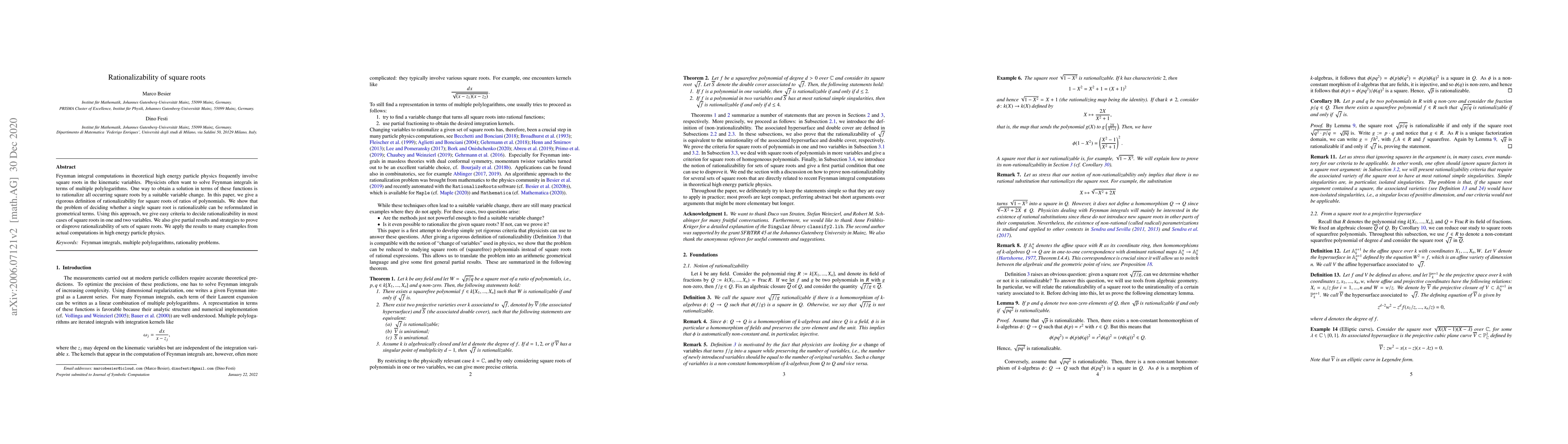 This paper rigorously defines rationalizability for square roots of ratios of polynomials and reformulates the problem in geometrical terms. It provides criteria to determine rationalizability for square roots in one and two variables, and applies these findings to examples from high energy particle physics computations.
