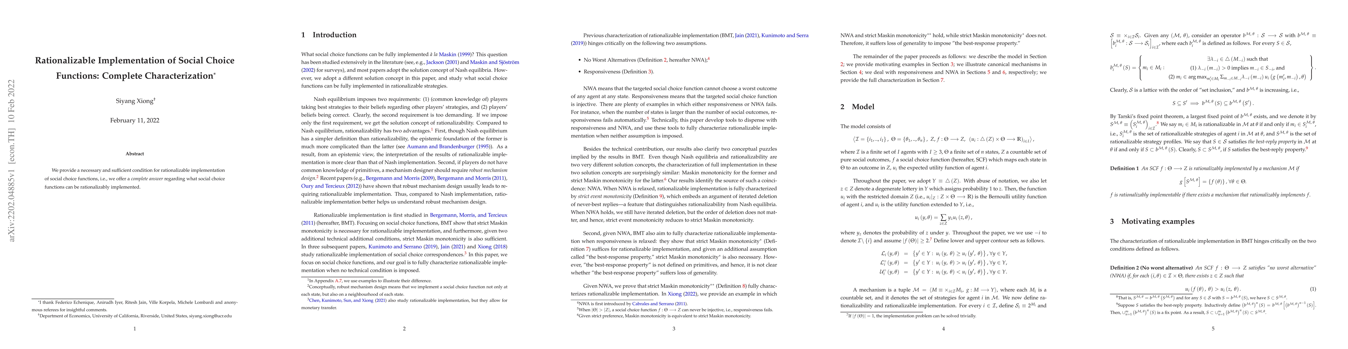 Summary: This paper presents a comprehensive, necessary, and sufficient condition for the rationalizable implementation of social choice functions, fully characterizing which functions can be achieved through such rationalizable mechanisms.