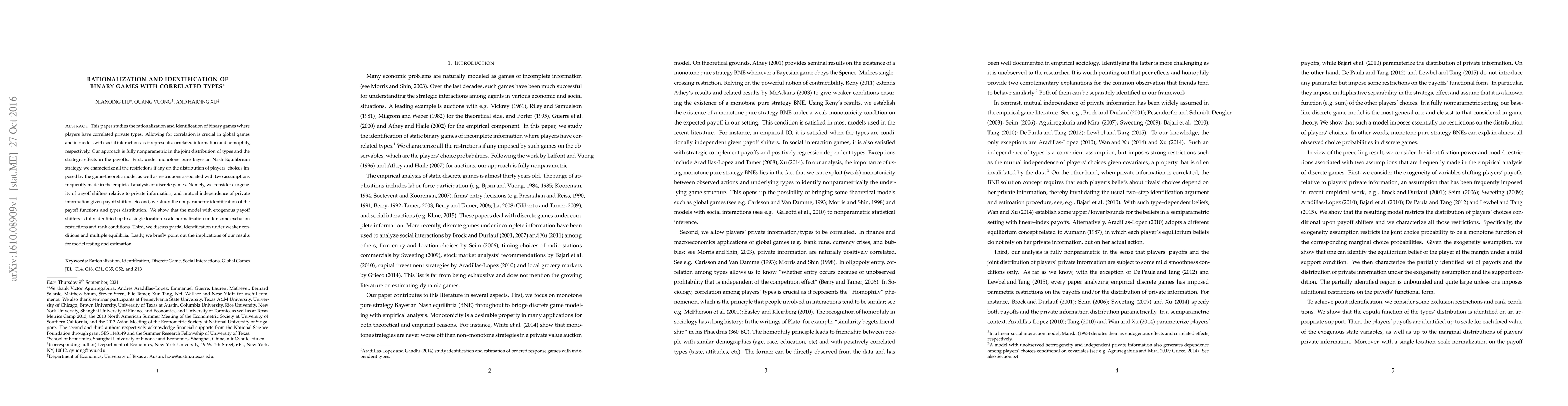 This paper explores the rationalization and identification of binary games with correlated player types, employing a fully nonparametric approach. It identifies restrictions on player choices and demonstrates the model's identification under various assumptions, including exogeneity and mutual independence, while discussing implications for model testing and estimation.