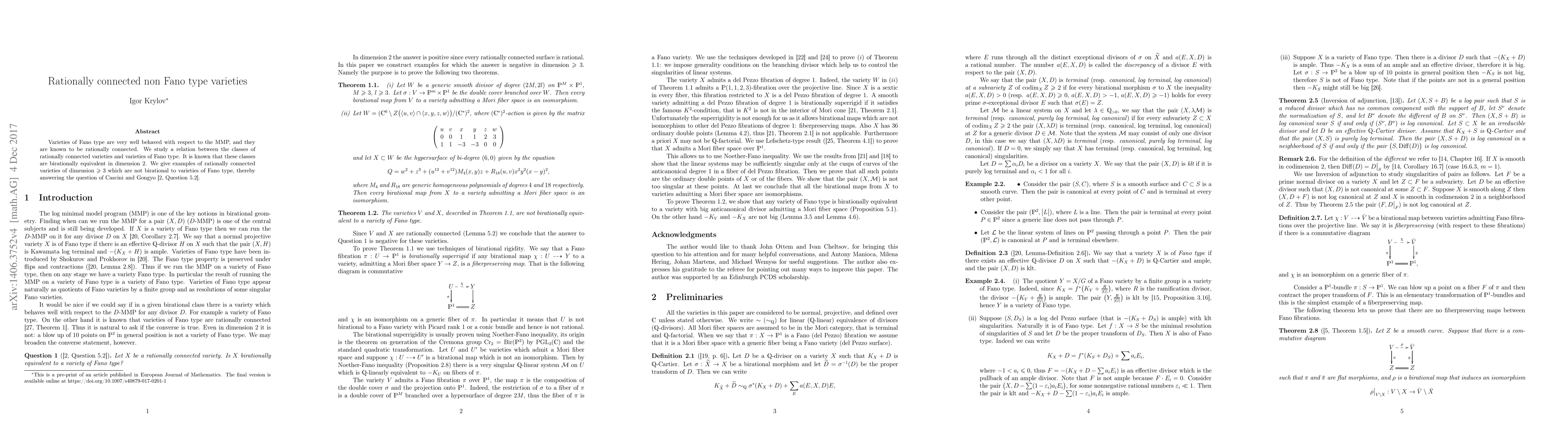 This paper explores the relationship between rationally connected varieties and Fano type varieties, presenting examples of rationally connected varieties of dimension $\geqslant 3$ that are not birationally equivalent to Fano type varieties, thus addressing a question posed by Cascini and Gongyo.