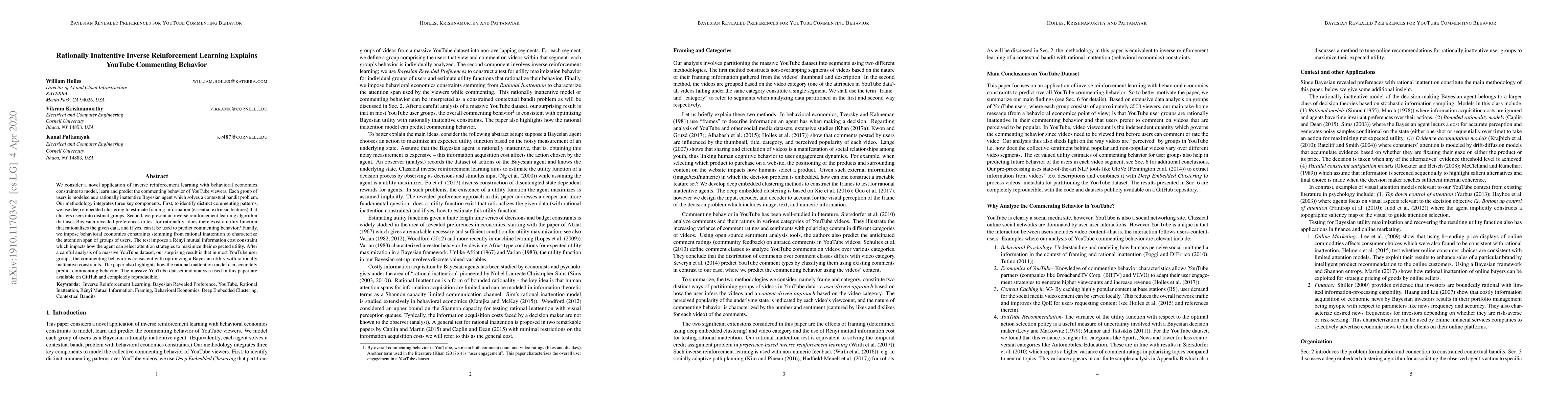 This paper applies inverse reinforcement learning with rational inattention to model YouTube commenting behavior, showing that users' commenting patterns align with optimizing a utility function under attention constraints. The methodology uses deep clustering and Bayesian revealed preferences, and the results indicate that most user groups exhibit behavior consistent with rationally inattentive agents.