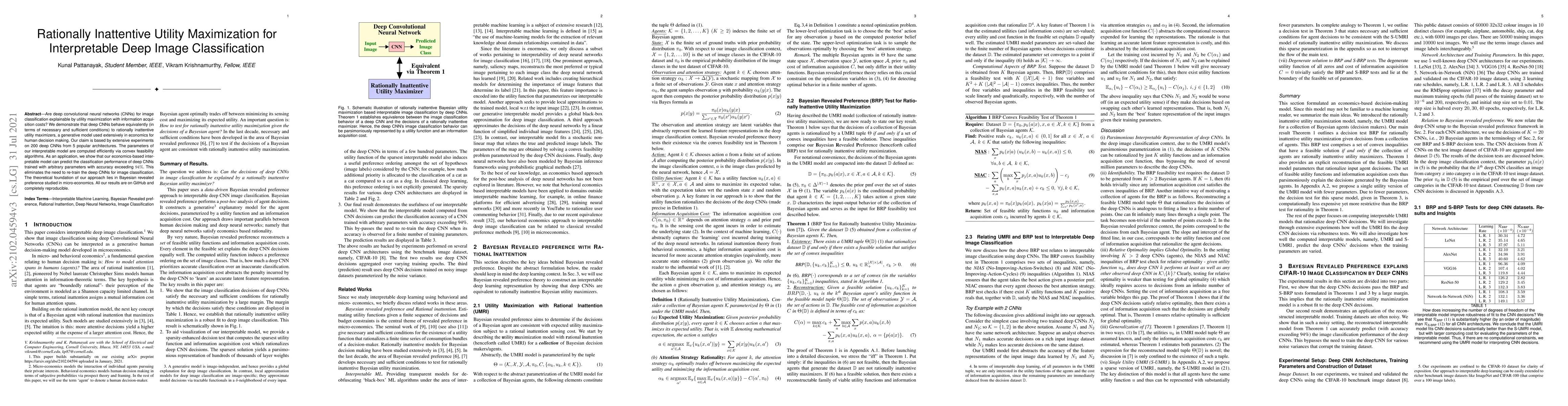 Are deep convolutional neural networks (CNNs) for image classification explainable by utility maximization with information acquisition costs? We demonstrate that deep CNNs behave equivalently (in terms of necessary and sufficient conditions) to rationally inattentive utility maximizers, a generative model used extensively in economics for human decision making. Our claim is based by extensive experiments on 200 deep CNNs from 5 popular architectures. The parameters of our interpretable model are computed efficiently via convex feasibility algorithms. As an application, we show that our economics-based interpretable model can predict the classification performance of deep CNNs trained with arbitrary parameters with accuracy exceeding 94% . This eliminates the need to re-train the deep CNNs for image classification. The theoretical foundation of our approach lies in Bayesian revealed preference studied in micro-economics. All our results are on GitHub and completely reproducible.