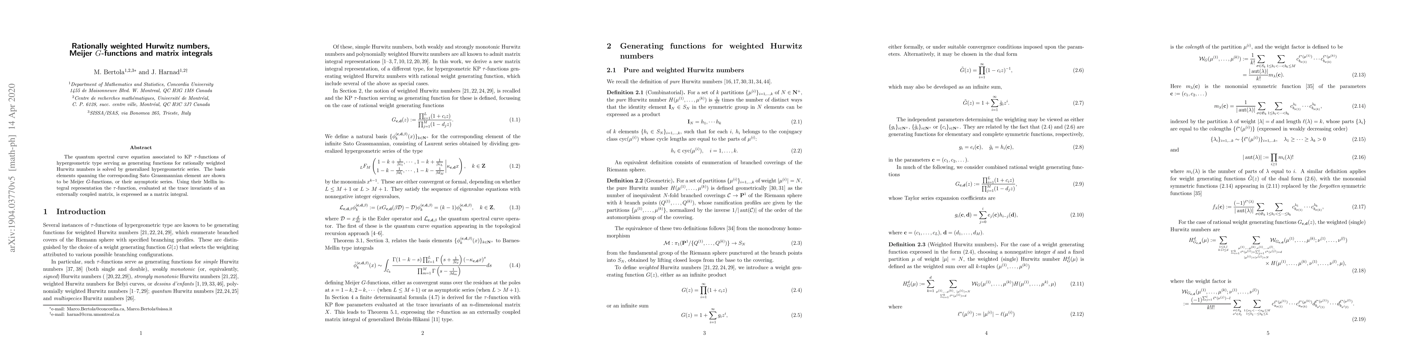 The quantum spectral curve equation associated to KP $\tau$-functions of hypergeometric type serving as generating functions for rationally weighted Hurwitz numbers is solved by generalized hypergeometric series. The basis elements spanning the corresponding Sato Grassmannian element are shown to be Meijer $G$-functions, or their asymptotic series. Using their Mellin integral representation the $\tau$-function, evaluated at the trace invariants of an externally coupled matrix, is expressed as a matrix integral.